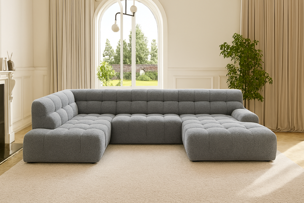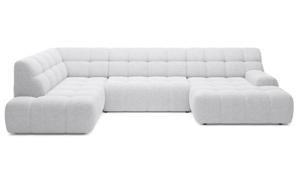 Szerokie siedziska, geometryczne przeszycia i solidna konstrukcja nadają mu wyraz pewności i elegancji, a kształt litery U tworzy przytulną przestrzeń sprzyjającą wspólnemu relaksowi.