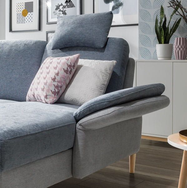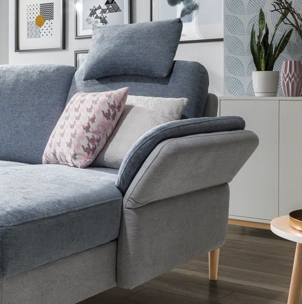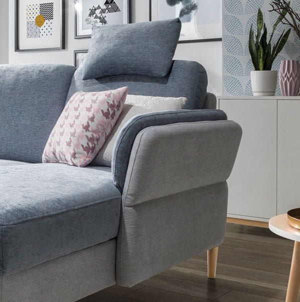 Dbałość o detale widać w każdym calu – od kontrastowych przeszyć i stębnówki, która dodaje charakteru, po pełne obicie tkaniną główną, nawet w części pleców. Dzięki temu narożnik może stanąć swobodnie w centrum pokoju, prezentując się elegancko z każdej strony.