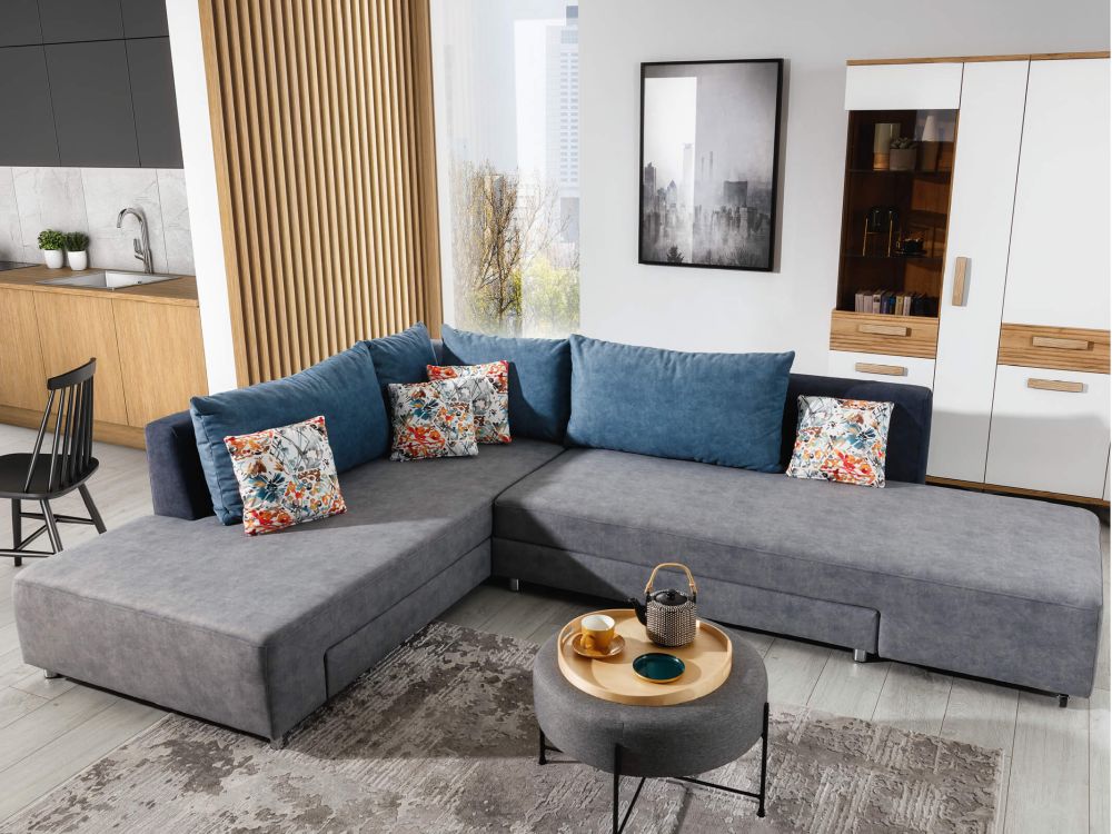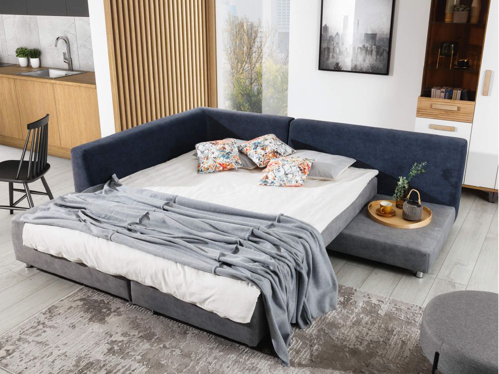 Jego autorski, a zarazem prosty system rozkładania sprawia, że w mgnieniu oka przekształcisz go w przestronne łóżko o imponującej powierzchni snu – aż 202 cm x 166 cm. Wystarczy delikatnie przesunąć element, by cieszyć się wygodnym miejscem do spania, idealnym zarówno dla gości, jak i codziennego użytkowania. Dzięki temu narożnik staje się praktycznym rozwiązaniem dla tych, którzy cenią sobie wielofunkcyjność bez kompromisów.