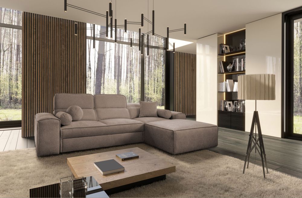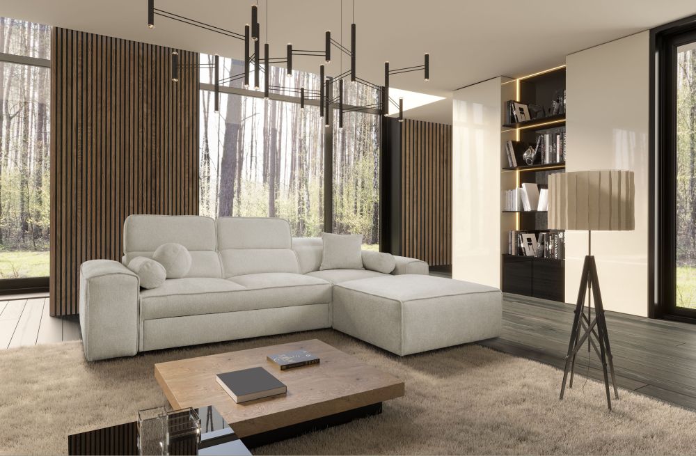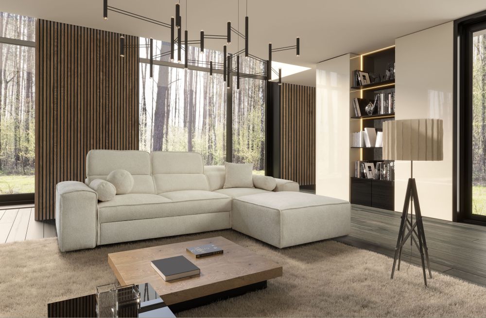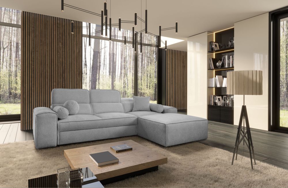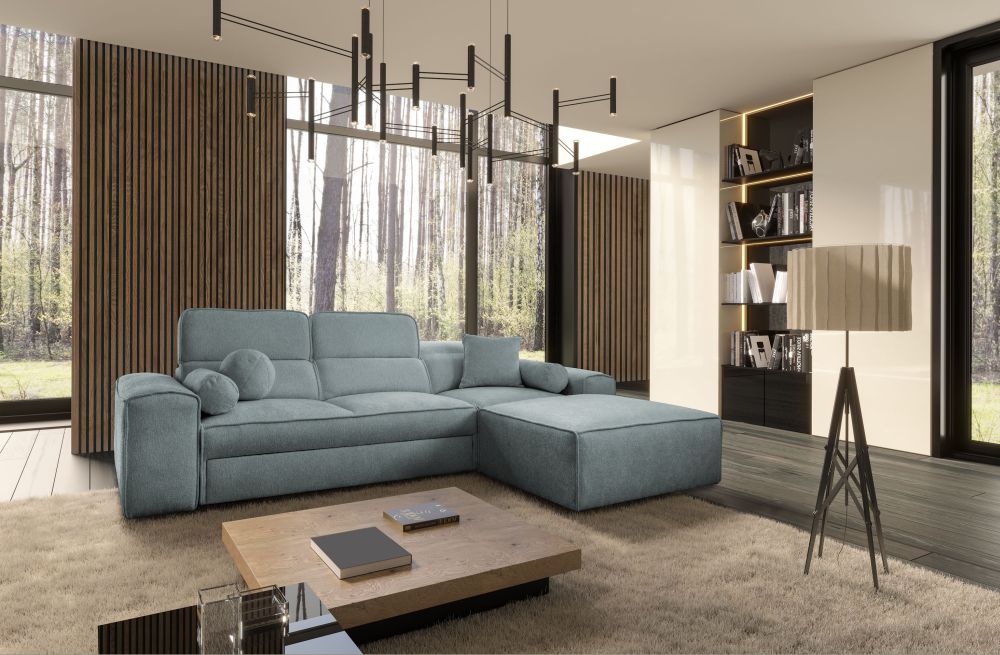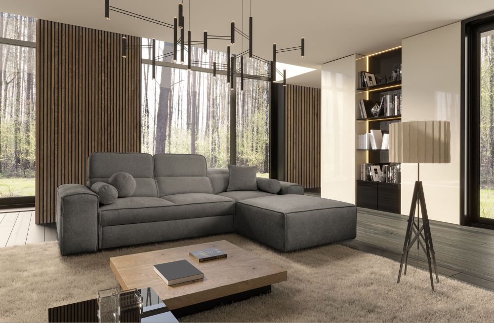 CHARLES 1 to narożnik, który wykracza poza standardowe rozumienie mebla wypoczynkowego. To propozycja dla osób, które chcą połączyć funkcjonalność, luksus i personalizację w jednym projekcie. Dzięki funkcji spania typu delfin szybko zmienisz salon w przytulną sypialnię, a wygodne, regulowane zagłówki zapewnią Ci maksymalny komfort podczas codziennego relaksu.