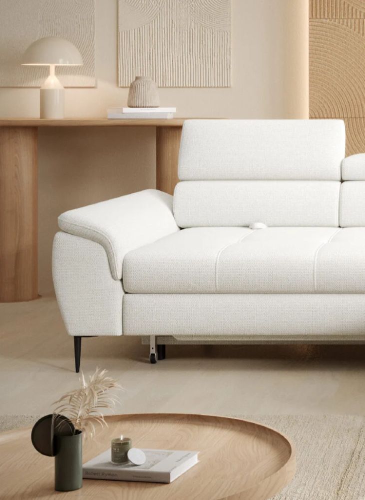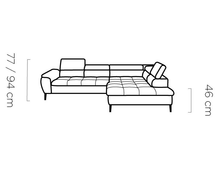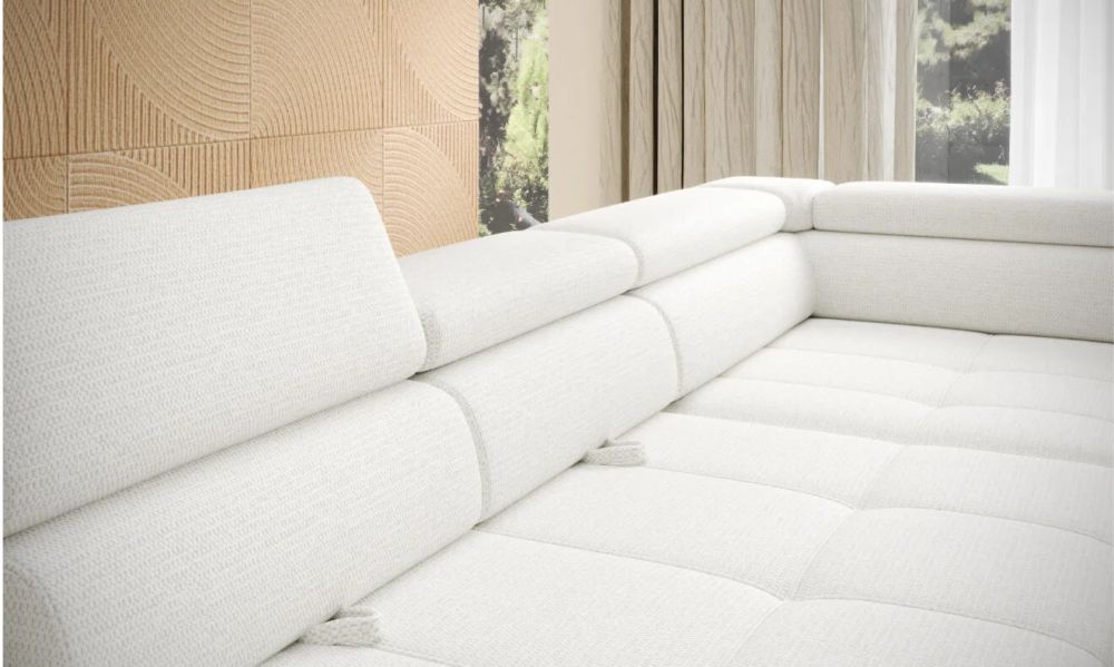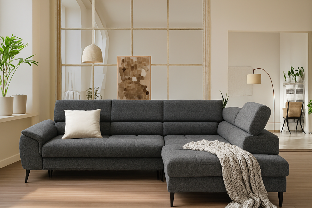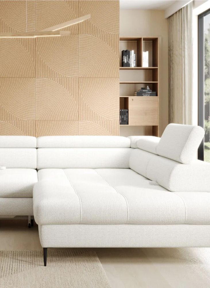 Nowoczesny narożnik ETERNO łączy elegancję z funkcjonalnością. Dzięki funkcji spania typu „delfin”, pojemnikowi na pościel oraz regulowanym oparciom i zagłówkom, staje się centrum komfortu w Twoim salonie. Idealny do relaksu, pracy czy wieczornego odpoczynku z rodziną i przyjaciółmi.