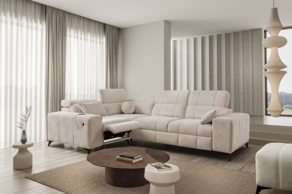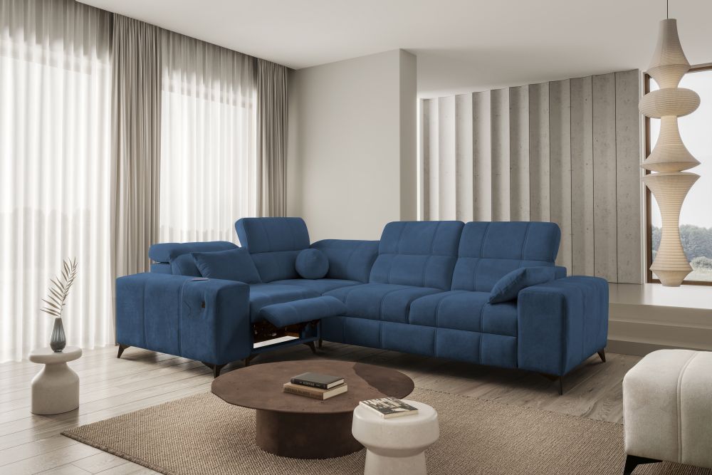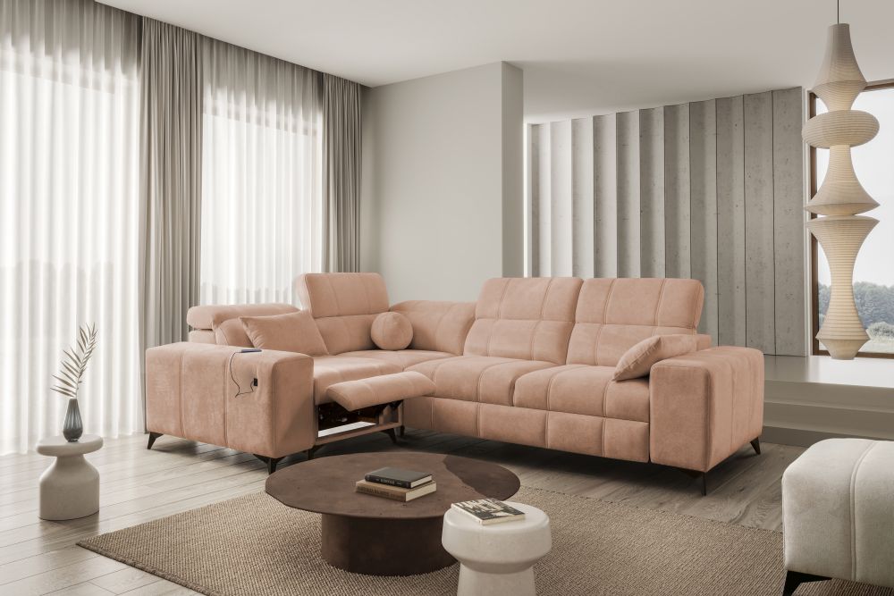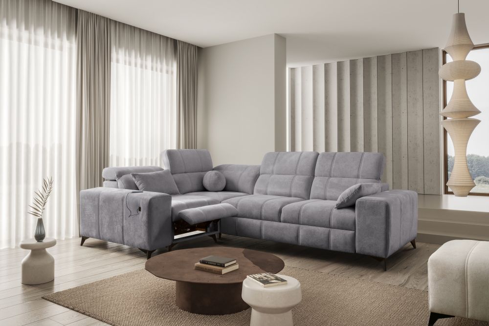 Model ten zachwyca dopracowaną formą, regulowanymi zagłówkami oraz elektryczną funkcją relaks, która pozwala w jednej chwili zamienić narożnik w strefę prawdziwego odpoczynku. Wbudowane gniazdo USB to praktyczny dodatek, który idealnie wpisuje się w potrzeby nowoczesnych wnętrz. Funkcja spania codziennego z automatem DELFIN gwarantuje łatwe i szybkie rozkładanie oraz komfortową powierzchnię snu.