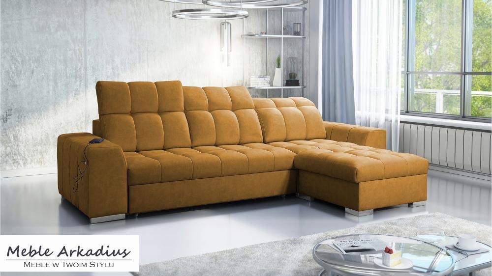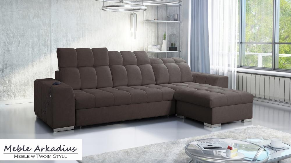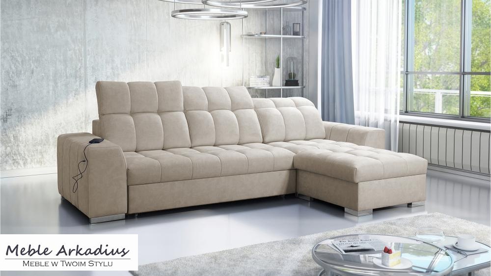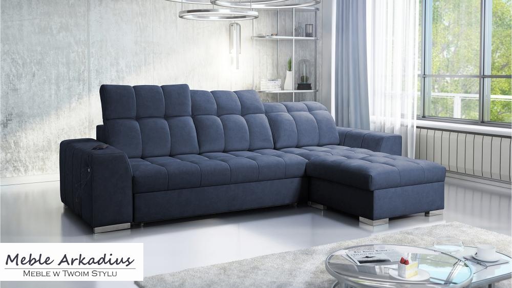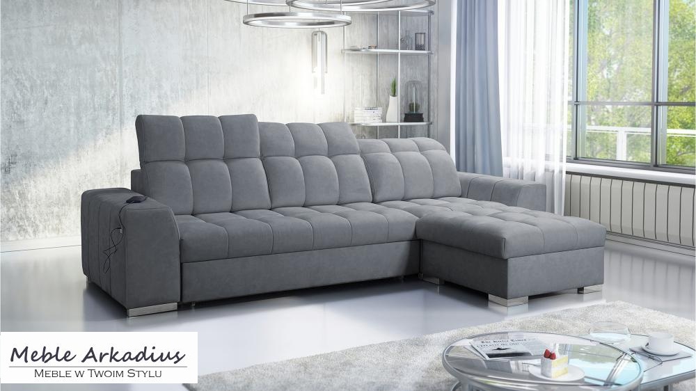 Wygoda idzie tutaj w parze z nowoczesnością – narożnik wyposażony został w funkcjonalne gniazdo USB, które pozwala ładować telefon czy tablet bez potrzeby wstawania z kanapy. Dodatkowo dwa pojemniki na pościel oferują praktyczne miejsce do przechowywania, pomagając utrzymać porządek w salonie. Mechanizm rozkładania typu „delfin” umożliwia szybkie i łatwe przekształcenie narożnika w pełnowymiarowe łóżko, idealne do codziennego użytku.