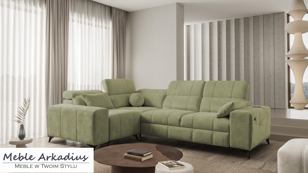 Narożnik DOLCE 2 to także wyjątkowy design i dbałość o każdy detal. Zintegrowane gniazdo USB pozwala na wygodne ładowanie urządzeń elektronicznych, co czyni go idealnym wyborem dla miłośników nowoczesnych technologii. Dzięki obiciu tkaniną klasy premium, dostępnej w szerokiej gamie kolorów, oraz możliwości personalizacji nóg, narożnik doskonale wpisze się w każdą aranżację wnętrza. Niezależnie od tego, czy preferujesz elegancki chrom, ciepłe drewno, czy minimalistyczny mat, DOLCE 2 dostosuje się do Twojego gustu.