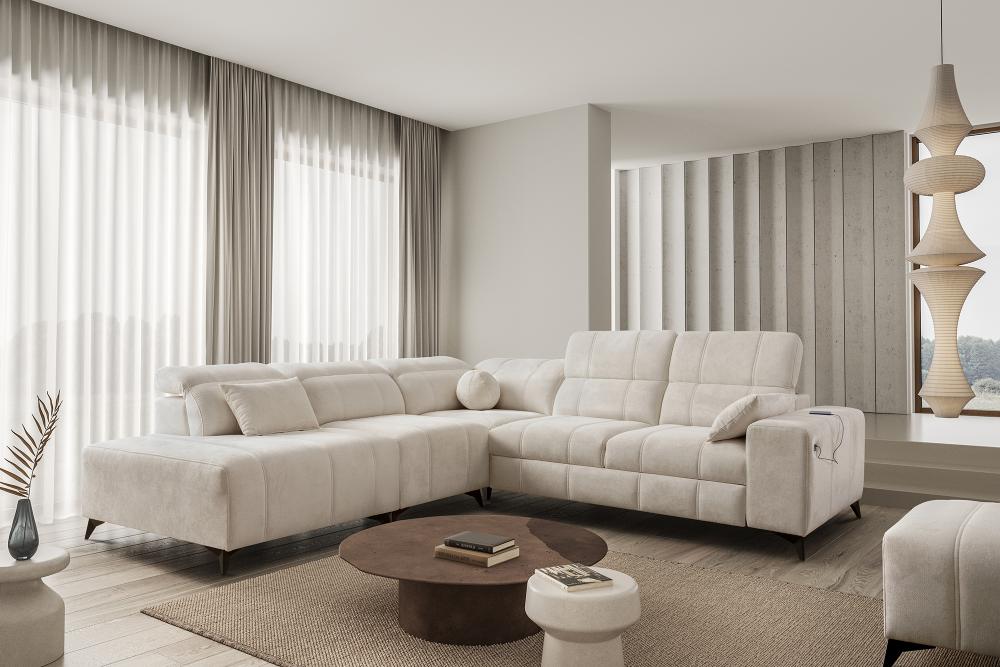Zapytaj o produktSalonowy narożnik z funkcją spania z długim szezlongiem z gniazdem USB DOLCE 9