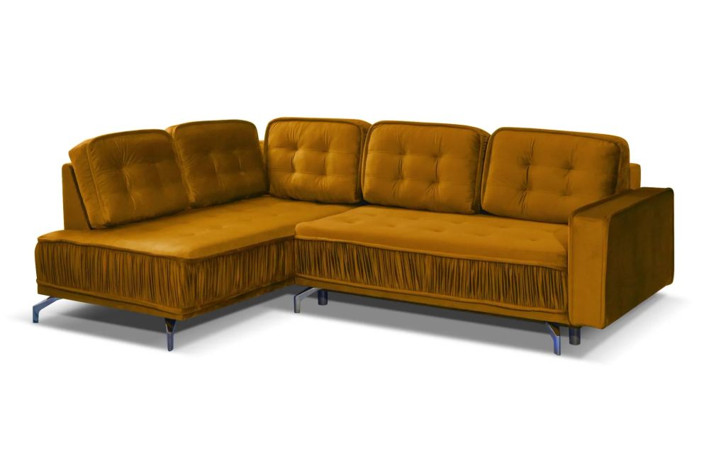 Wysokie metalowe nóżki w kolorze jak na zdjęciach nadają narożnikowi nowoczesnego charakteru i sprawiają, że bryła prezentuje się lekko. Dodatkowo ułatwiają utrzymanie czystości pod meblem, co jest dużym atutem w codziennym użytkowaniu.