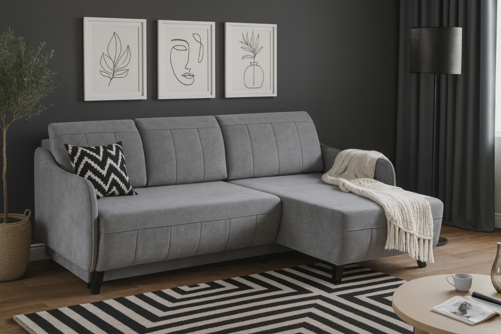 Narożnik posiada funkcję spania codziennego z niezawodnym systemem rozkładania DL, który umożliwia szybkie i łatwe przygotowanie wygodnej powierzchni do snu. Dodatkowym atutem jest praktyczny pojemnik na pościel, pozwalający na wygodne przechowywanie. Uniwersalna konstrukcja umożliwia montaż narożnika zarówno w wersji lewej, jak i prawej.