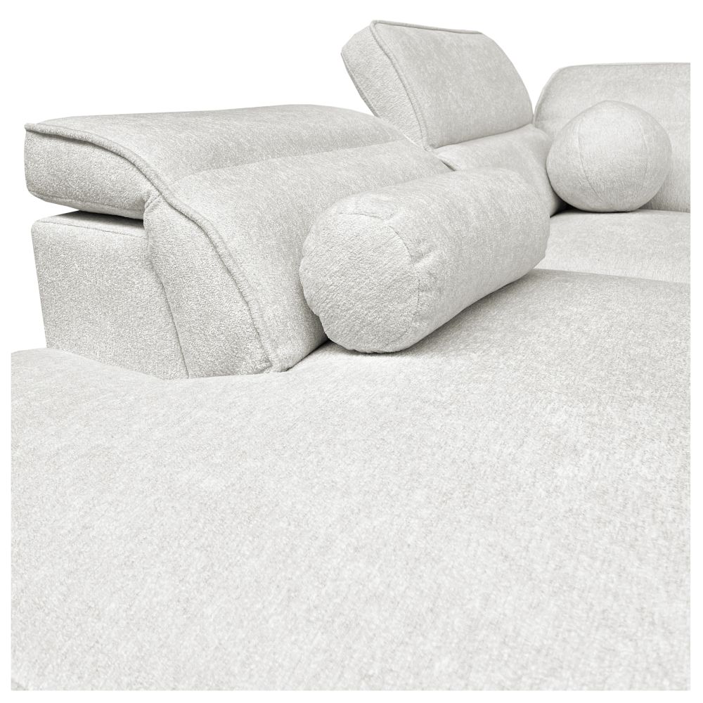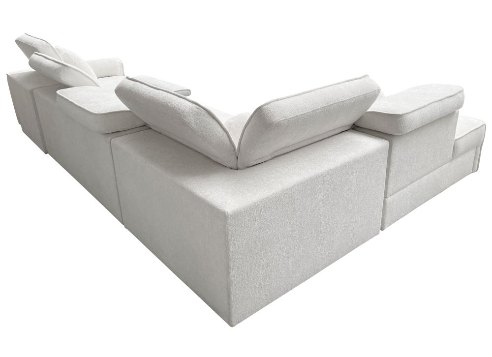 Wyróżnia się wyjątkową funkcjonalnością: narożnik posiada nowoczesny system spania typu delfin z powierzchnią 198 × 127 cm oraz elektrycznie wysuwany podnóżek, sterowany intuicyjnymi przyciskami. Praktyczny pojemnik na pościel pozwala utrzymać porządek, a sześć regulowanych zagłówków umożliwia perfekcyjne dopasowanie podparcia głowy do Twoich potrzeb. Dodatkowym atutem jest tapicerowany tył, dzięki czemu mebel można ustawić również na środku pomieszczenia.