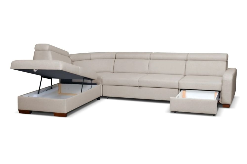 Jeśli szukasz dużego narożnika do salonu z funkcją spania, pojemnikiem na pościel, regulowanymi zagłówkami i nowoczesnym designem – DIAMANTE 9 z kolekcji Meble Arkadius będzie doskonałym wyborem.