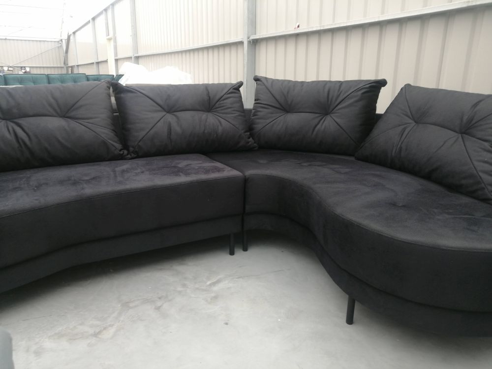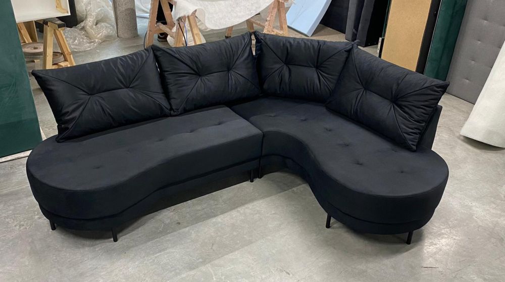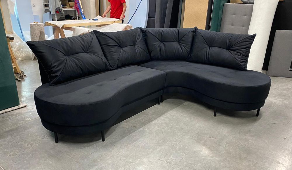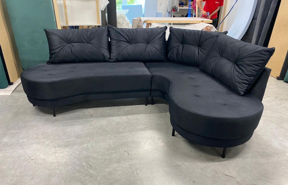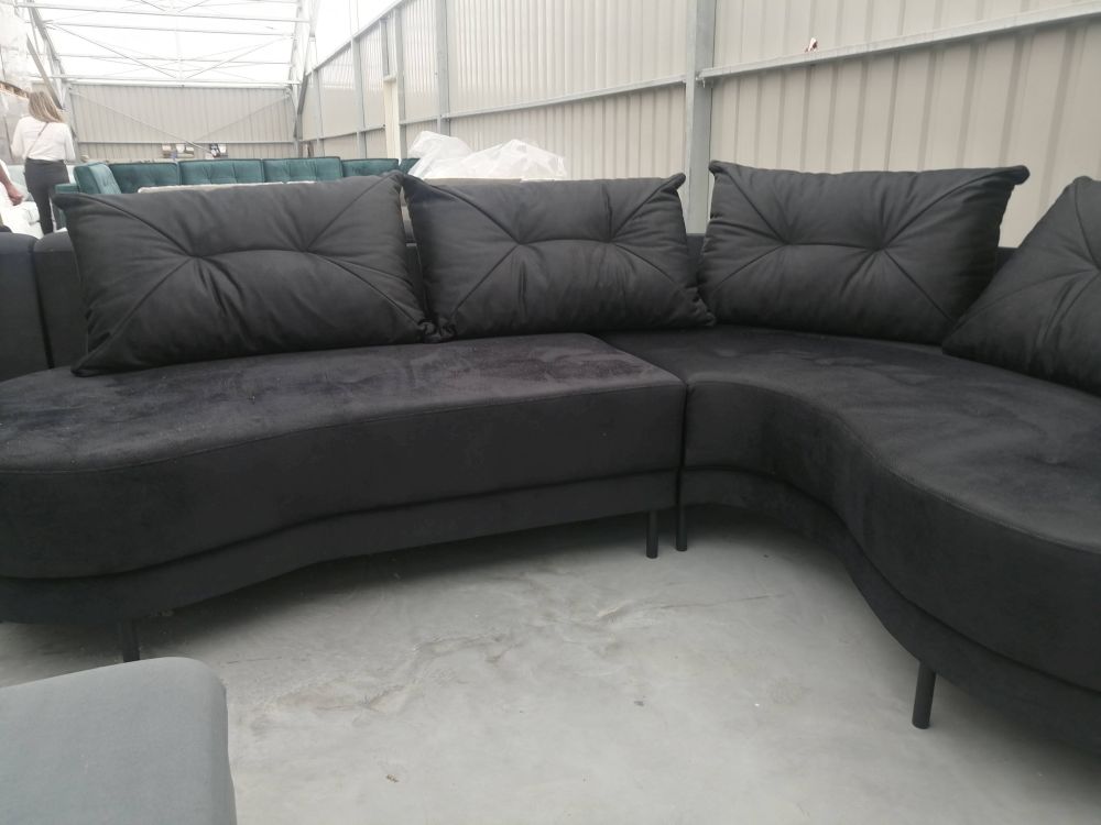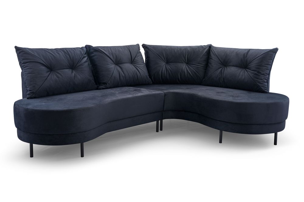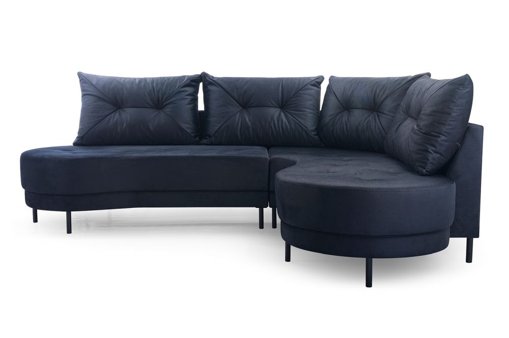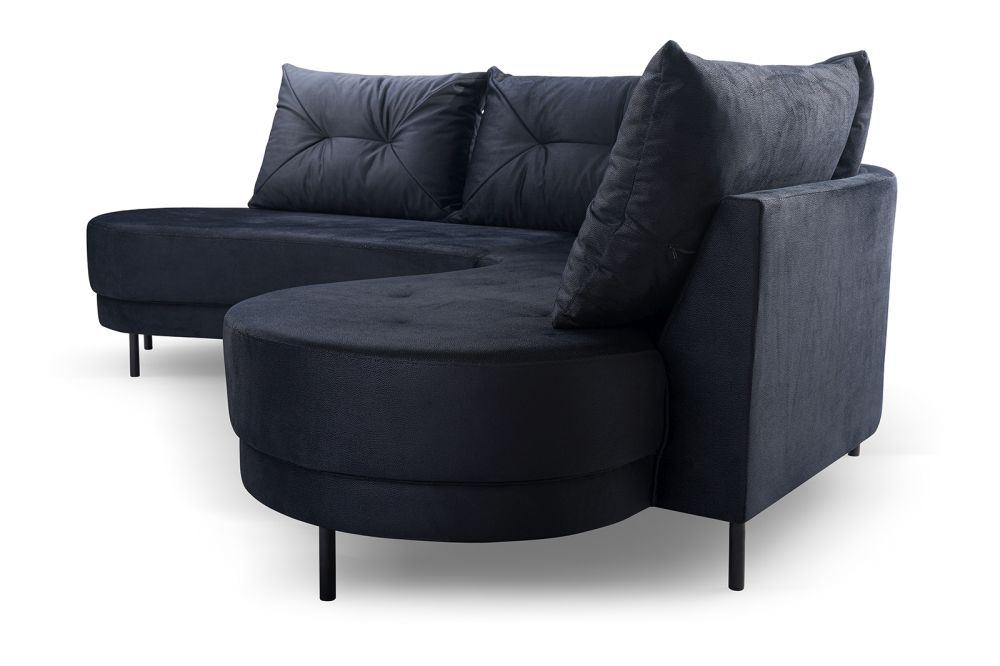 Narożnik zaokrąglony z czarnymi nózkami, narożnik na wysokich nóżkach. Dzięki zastosowaniu tkanin zmywalnych to również propozycja do miejsc użyteczności publicznej – kanapa do poczekalni, narożna sofa do gabinetu, lub narożnik do biura.