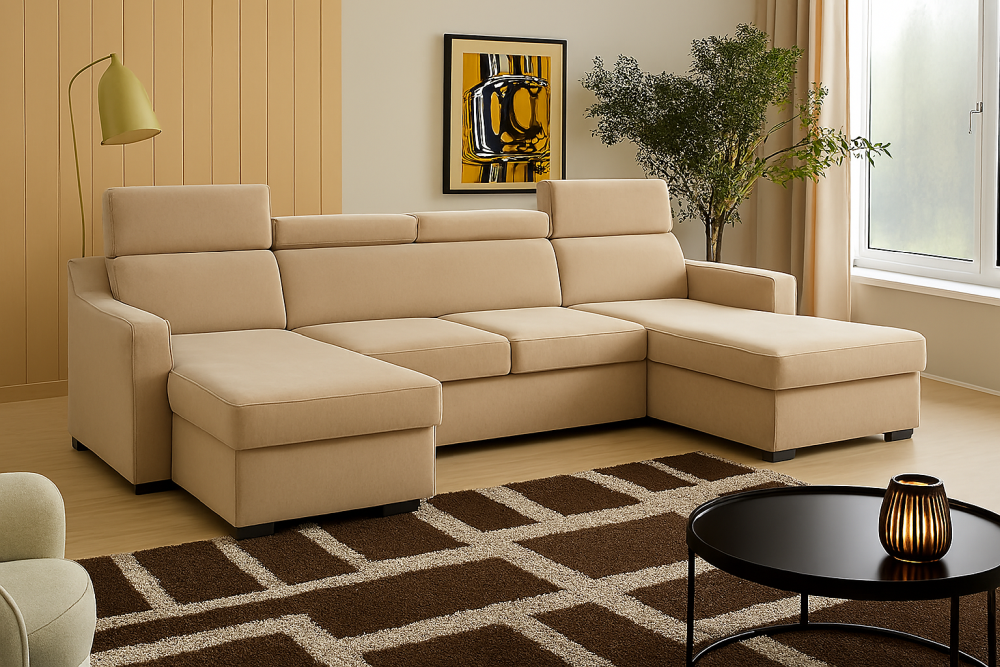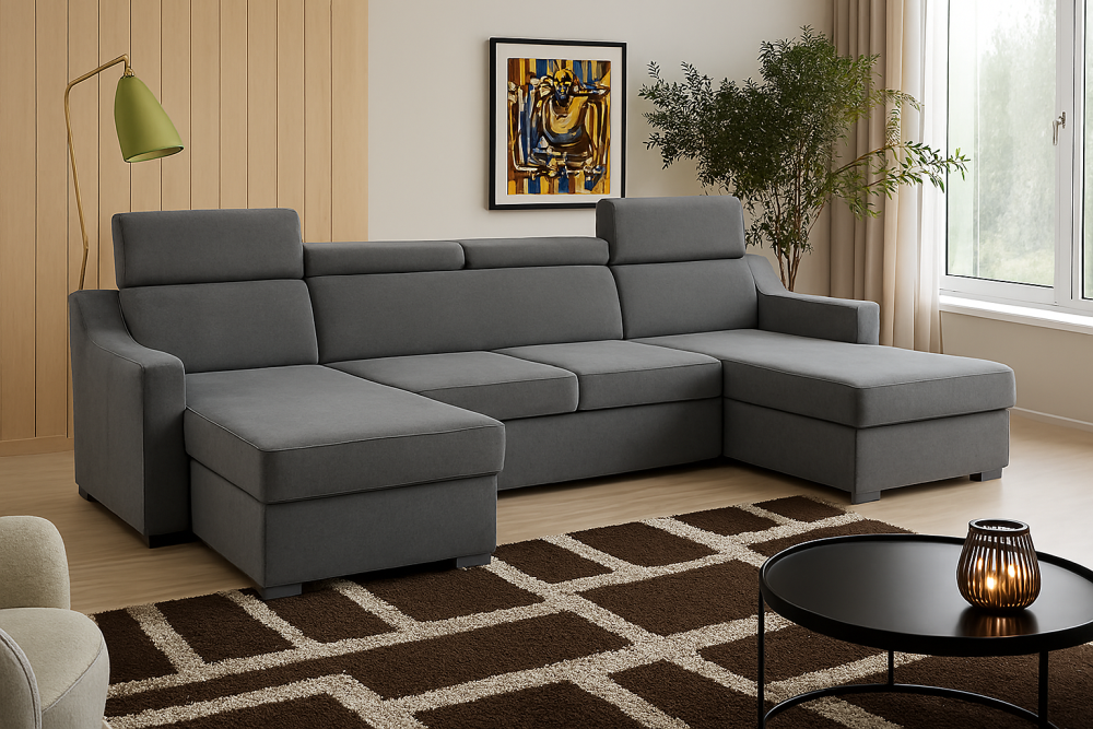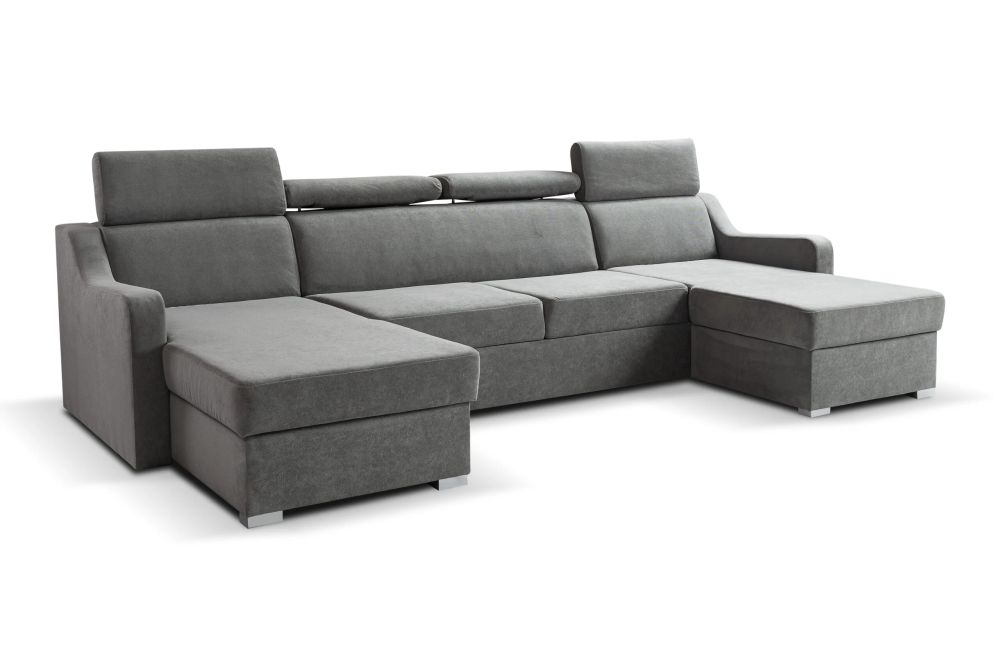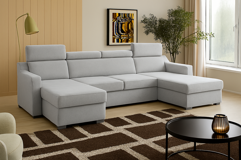 Niedrogi narożnik U z funkcją spania MONARI to propozycja dla osób, które chcą połączyć elegancję, komfort i funkcjonalność w rozsądnej cenie. Jego nowoczesna forma z regulowanymi zagłówkami zapewnia wygodę podczas codziennego odpoczynku, a starannie dobrane tkaniny premium nadają mu wyjątkowy charakter i sprawiają, że pięknie prezentuje się w każdym wnętrzu.