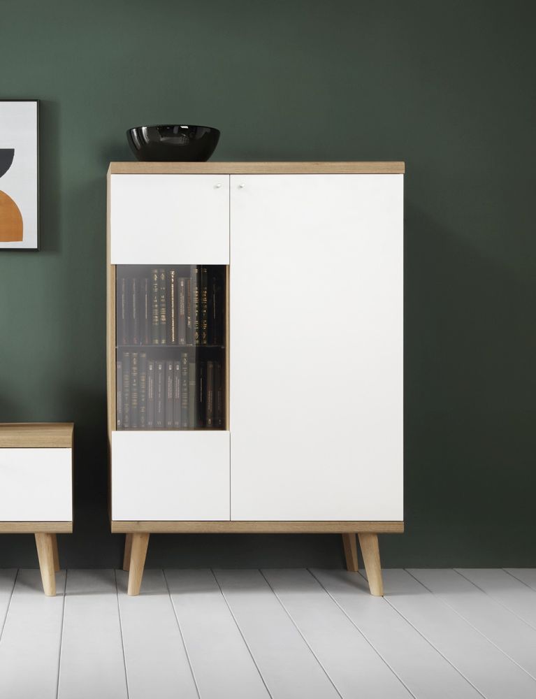 Niska witryna ze szkłem w stylu skandynawskim PRIMAVERA 90 w stylu skandynawskim idealnie wpasowuje się w nowoczesne wnętrza, gdzie dominuje jasna kolorystyka, naturalne materiały i minimalistyczne wzornictwo. Może być doskonałym uzupełnieniem salonu, jadalni lub kuchni, nadając pomieszczeniu świeżości, elegancji i przytulności.