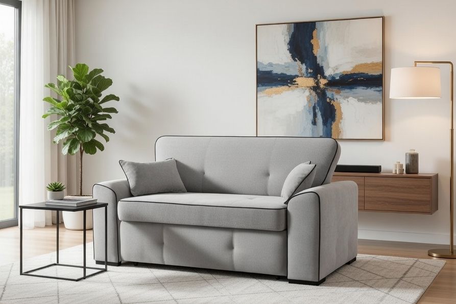 To funkcjonalna sofa dwuosobowa z funkcją spania, która łączy nowoczesny design, wygodę i trwałość – idealna do mniejszych przestrzeni, gdzie liczy się każdy centymetr.