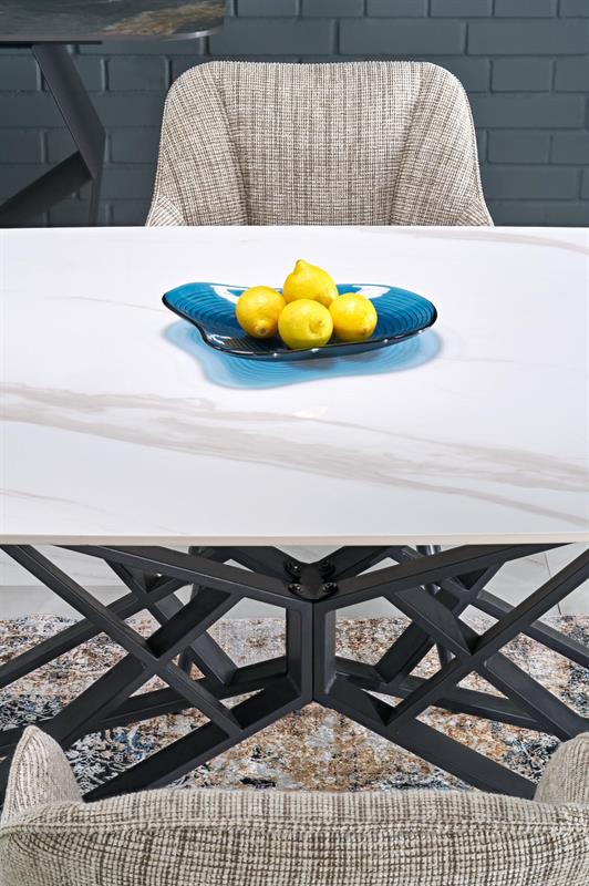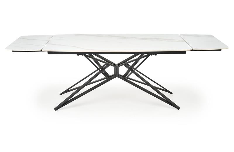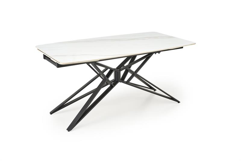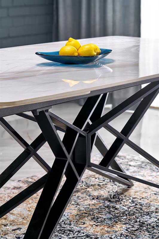 Blat wykonany z wysokogatunkowego spieku zachwyca eleganckim wykończeniem w kolorze białego marmuru, a solidna konstrukcja oparta na czarnych, stalowych nogach malowanych proszkowo gwarantuje stabilność i trwałość na lata. Dzięki funkcji rozkładania stół z łatwością dopasuje się do każdej okazji – od codziennych posiłków po duże rodzinne spotkania.