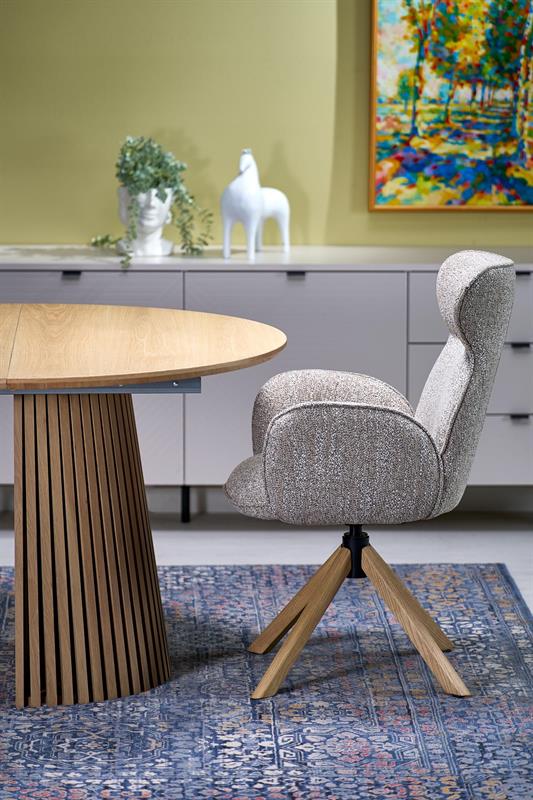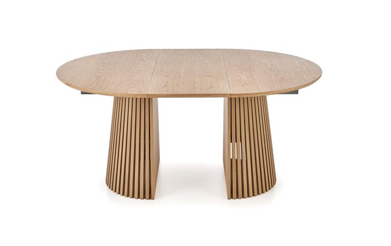 Okrągły blat o średnicy 120 cm w kilka chwil można rozłożyć do imponującej długości aż 210 cm, zmieniając go w komfortowy stół owalny. To idealne rozwiązanie zarówno na codzienne posiłki, jak i większe spotkania rodzinne czy przyjęcia z przyjaciółmi.