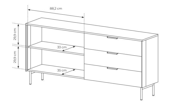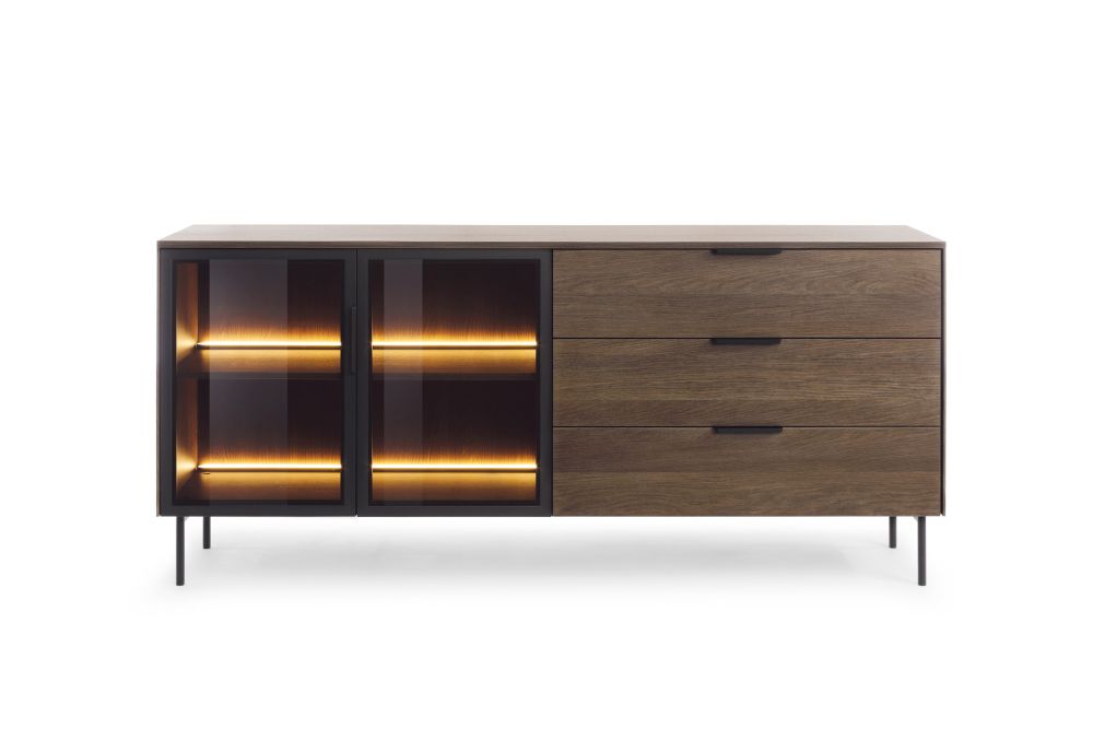 Dzięki wysokim metalowym nogom komoda zyskuje lekkość formy, a jednocześnie ułatwia utrzymanie czystości. Wyposażona w dwie przeszklone drzwi z hartowanego szkła oraz trzy długie szuflady na prowadnicach kulkowych z pełnym wysuwem, oferuje sporo miejsca na przechowywanie i ekspozycję ulubionych przedmiotów.