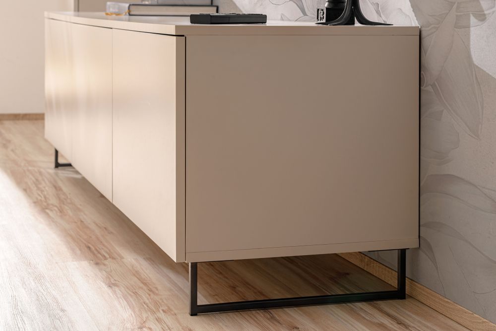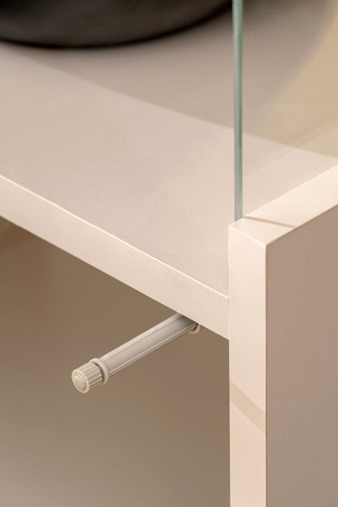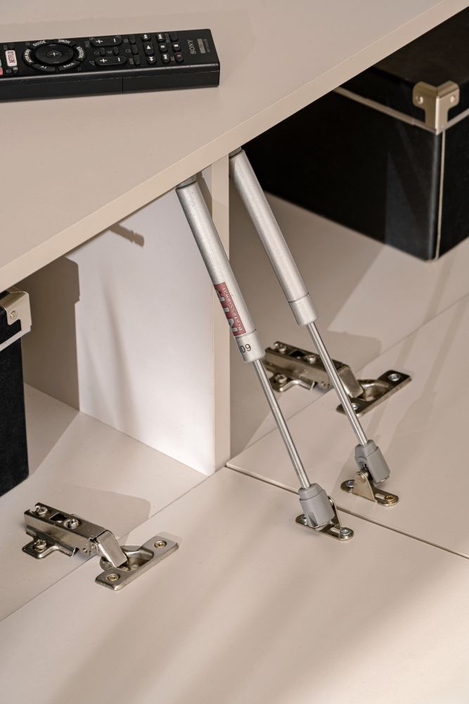 Dodatkowo, podwieszana meblościanka kaszmir z serii PRISMA została wyposażona w siłowniki gazowe, które umożliwiają łatwe i ciche otwieranie drzwi oraz szuflad. Otwieranie „push-click” dodatkowo podnosi komfort użytkowania, eliminując potrzebę uchwytów i zachowując minimalistyczny design.