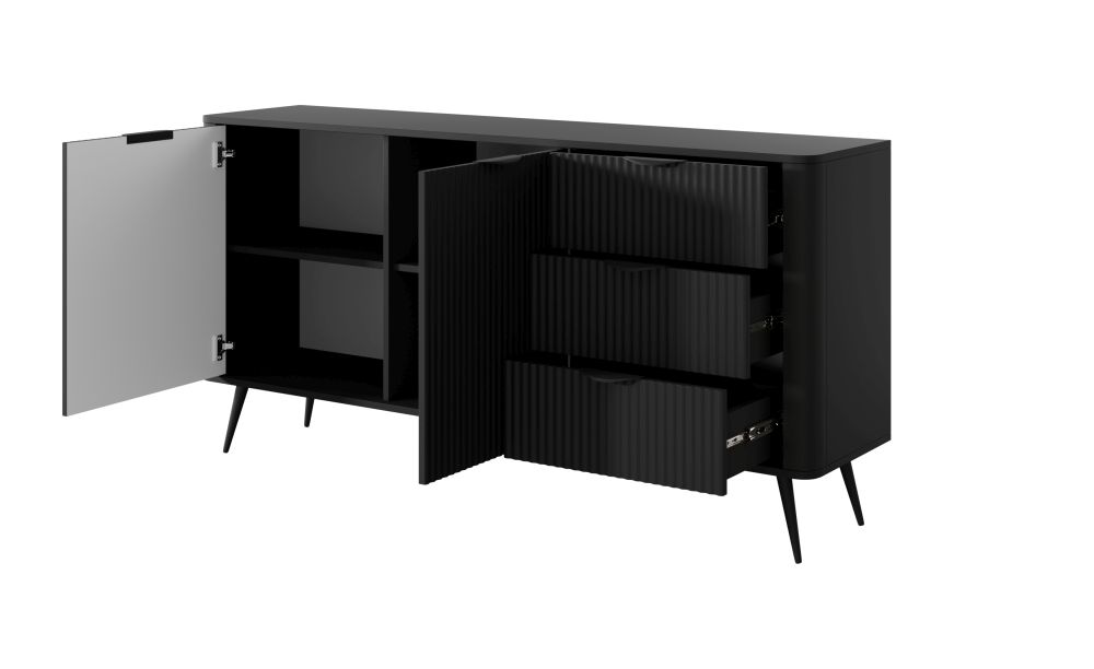 Korpus wykonano z trwałej płyty wiórowej laminowanej E05 o grubości 16 mm i wzbogacono o subtelną, zaobloną listwę MDF. Fronty z płyty MDF 18 mm pokryte są głęboką czernią, co w połączeniu z czarnymi, metalowymi uchwytami tworzy spójną, minimalistyczną całość. Wnętrze komody kryje dwie pojemne szafki oraz trzy praktyczne szuflady na kulkowych prowadnicach z pełnym wysuwem – idealne do przechowywania wszelkich domowych drobiazgów.