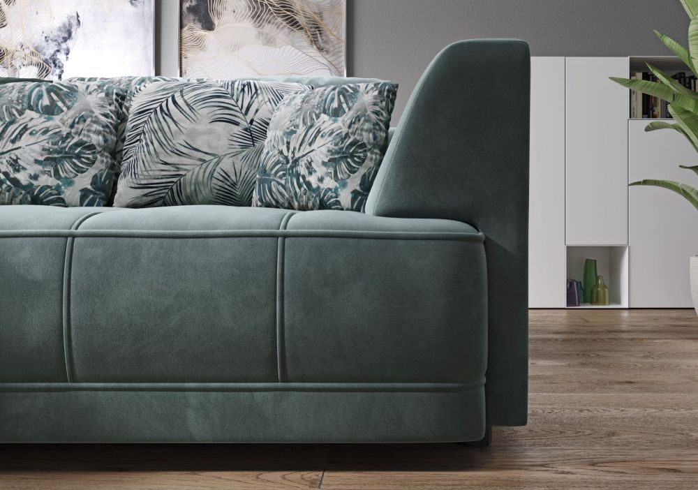 Sofa została wykonana z dbałością o każdy detal – od solidnego, drewnianego stelaża po precyzyjne przeszycia tapicerki, dostępnej w szerokiej gamie tkanin premium o wyjątkowej fakturze i trwałości.