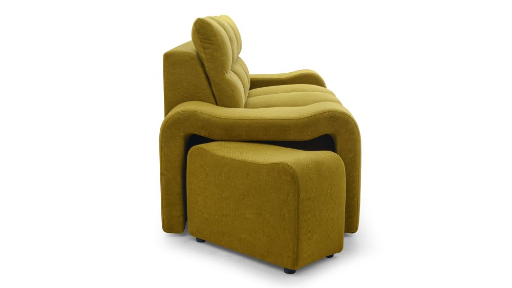 Nie zapomnieliśmy o dodatkowych możliwościach siedzenia. W zestawie znajdują się dwie wygodne pufy, które są nie tylko praktyczne, ale także pięknie wkomponowane w boki kanapy, dzięki czemu zachowasz harmonijny wygląd i funkcjonalność.