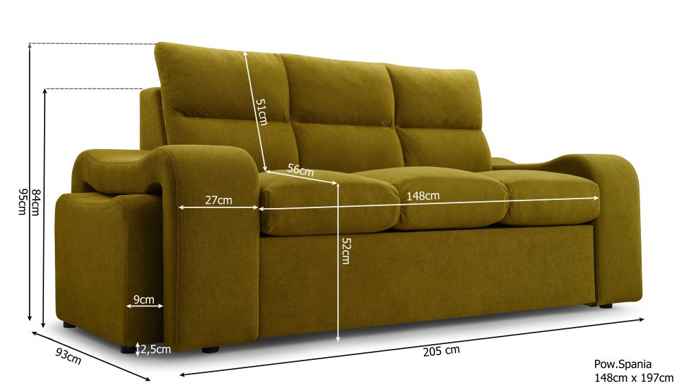 Wyobraź sobie szerokość 205 cm, na której możesz swobodnie rozciągnąć się po całym dniu pracy. A głębokość 93 cm zagwarantuje Ci wygodne oparcie dla pleców, zapewniając idealne wsparcie podczas relaksu.