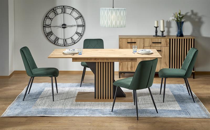 Wykonany z wysokiej jakości materiałów, ten rozkładany prostokątny stół na dużej podstawie to gwarancja trwałości i funkcjonalności. Jego blat z płyty meblowej laminowanej w kolorze dębu wotan emanuje ciepłem i elegancją, podczas gdy solidna noga w kolorze dębu wotan lub czarnym dodaje mu charakteru i nowoczesności.