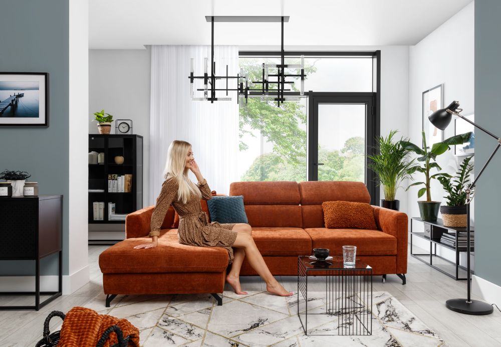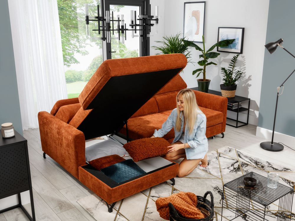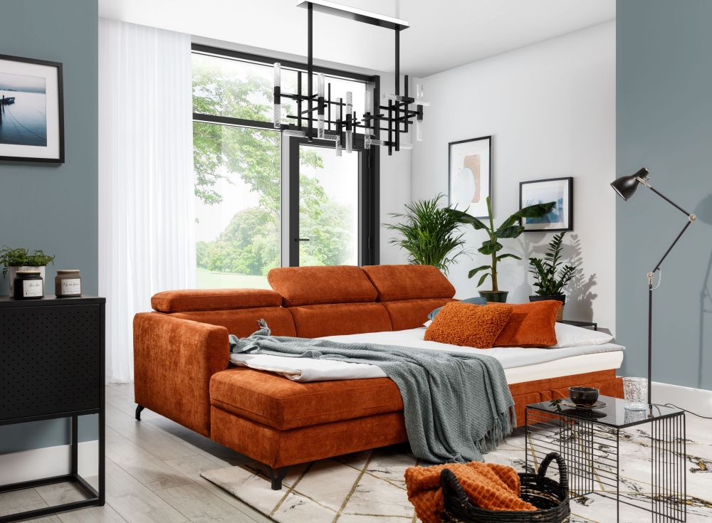 Ruda kanapa rozkładana rogowa MABEL to prawdziwie zjawiskowa rogówka, która z pewnością doda uroku i komfortu Twojemu salonowi.