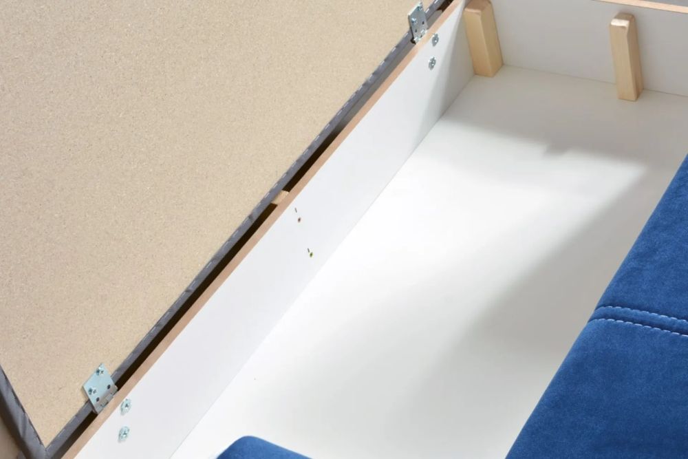 Dodatkowym atutem jest praktyczny pojemnik na pościel, który pozwala na wygodne przechowywanie kołdry, poduszek czy koca, pomagając utrzymać porządek w salonie.