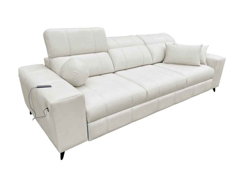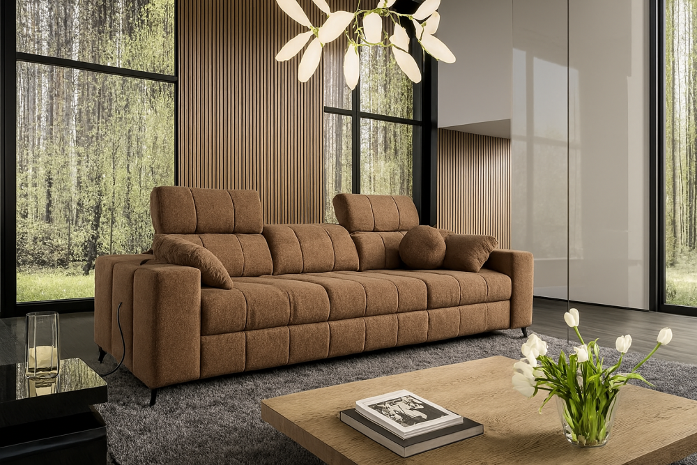 Rozkładana powierzchnia do spania pozwala w kilka chwil przekształcić sofę w komfortowe łóżko, idealne do codziennego użytkowania. Komfort zapewnia pianka utwardzona T-30, która została zastosowana zarówno w siedzisku, jak i w powierzchni spania. Dodatkowym atutem są trzy regulowane zagłówki, które można ustawić według własnych preferencji – idealne do wypoczynku z książką, filmem czy kawą. Funkcjonalność wzbogaca również nowoczesny port USB A+C, subtelnie wkomponowany w konstrukcję – idealny do ładowania urządzeń bez wstawania z kanapy.