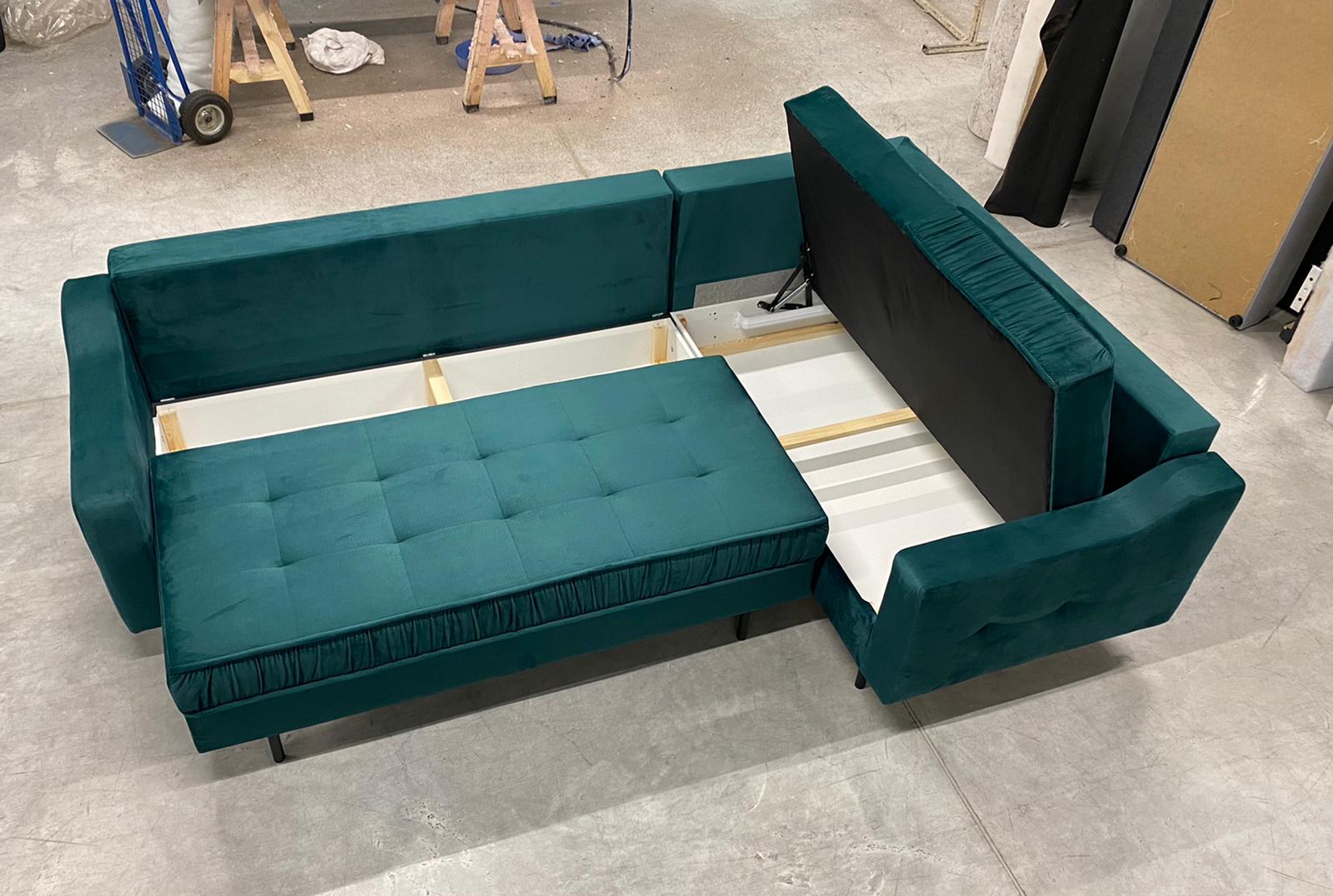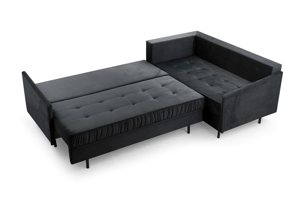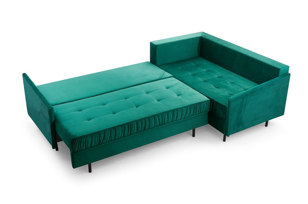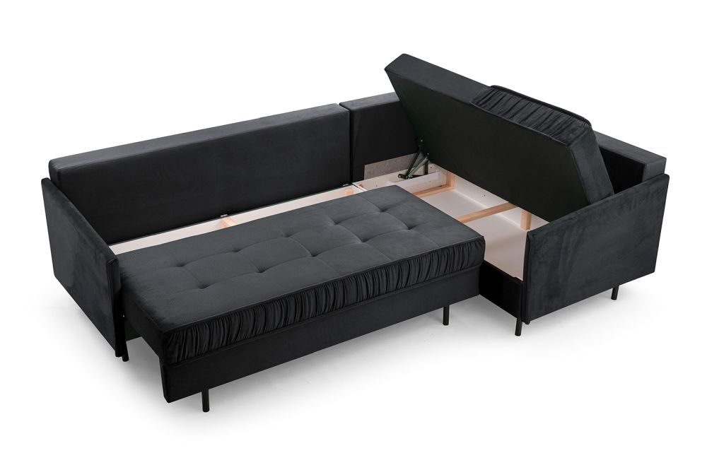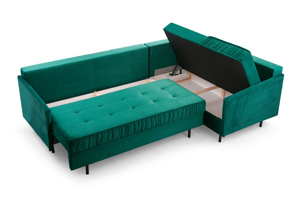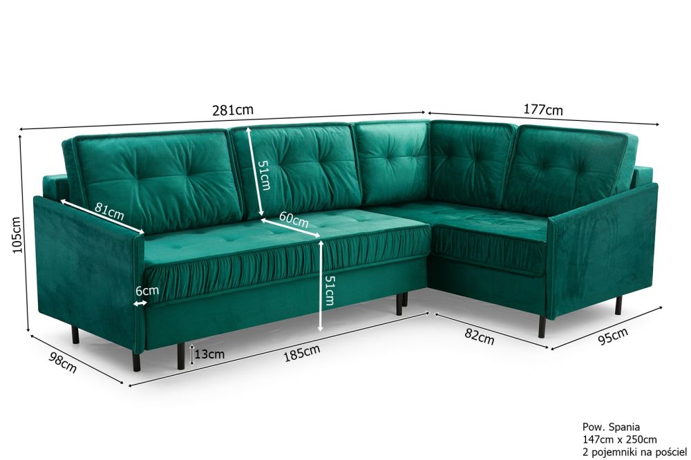 Dzięki szerokiej ofercie tkanin z łatwością wkomponujecie Państwo ten model do swojej aranżacji. Do wyboru mamy szeroką paletę kolorystycznych tkanin welurowych, hydrofobowych, jak i praktycznych, ponadczasowych plecionek. Zgodnie z ostatnimi trendami nasi klienci pytają o kolorystykę butelkowa zieleń, oraz o narożnik granatowy, ale kwestię wyboru tkanin pozostawiamy oczywiście Państwu. W zestawie z narożnikiem otrzymują Państwo wyjątkowe poduchy oparciowe, dwa sporej wielkości pojemniki na pościele i oczywiście funkcję spania, gdzie powierzchnia po rozłożeniu wynosi aż 147cm x 250cm.