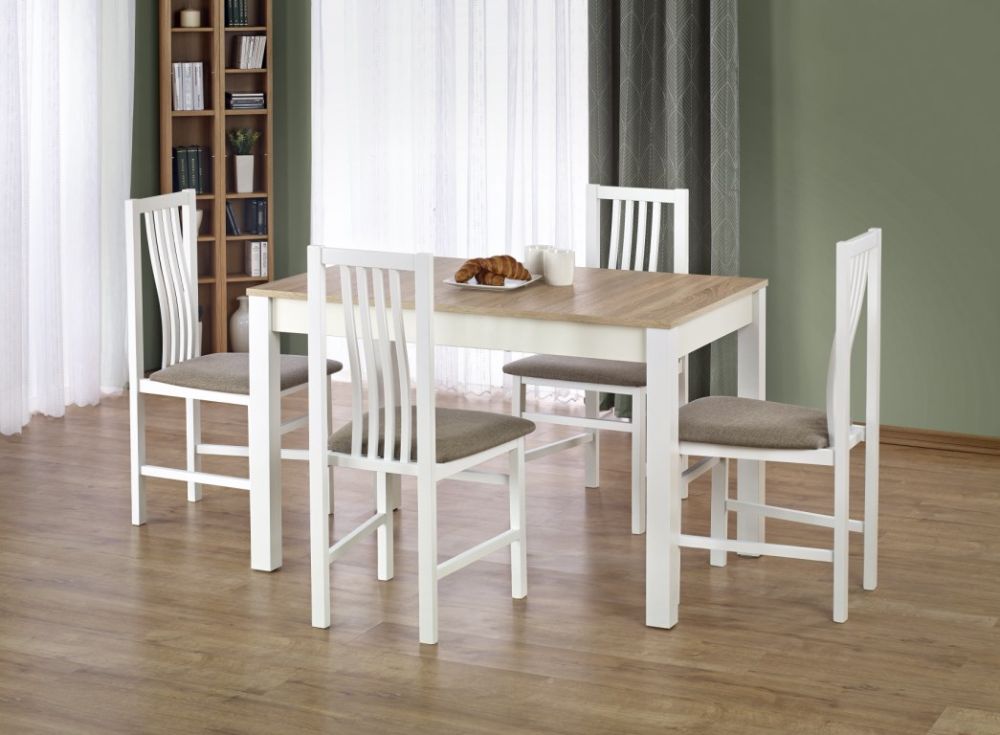 Ten stylowy stół do jadalni o prostych liniiach i minimalistycznym designie z pewnością zachwyci każdego miłośnika nowoczesnych rozwiązań. Wykonany z płyty laminowanej MDF, z wytrzymałym stelażem oraz obrzeżami z ABS, gwarantuje długą żywotność i łatwość w utrzymaniu czystości. Kombinacja dębu sonoma z białym kolorem nadaje mu niebanalny charakter i niepowtarzalny urok.