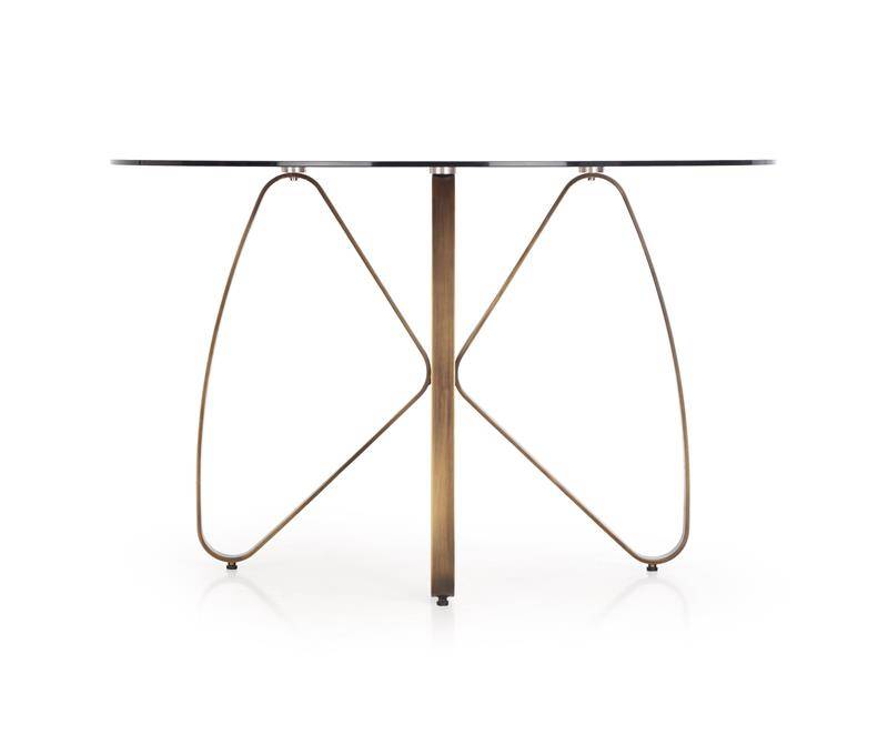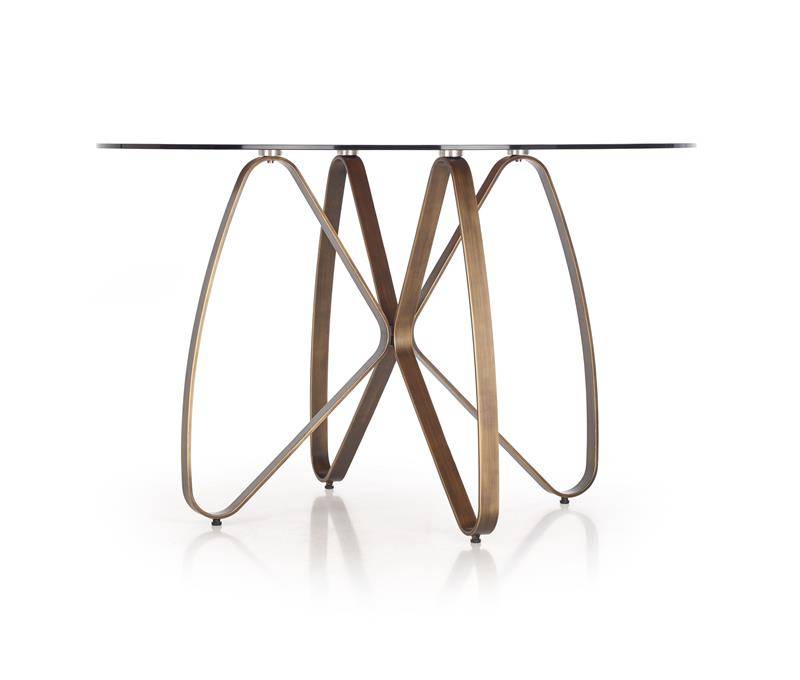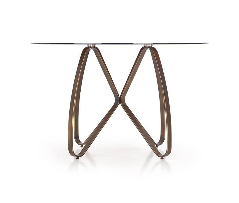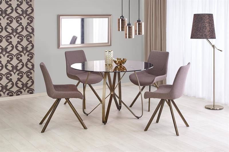 Stół okrągły ze szklanym blatem w kolorze brązowym, co nadaje mu eleganckiego i stylowego wyglądu. Nogi stołu wykonane są z malowanej na antyczny złoty kolor stali, co idealnie kontrastuje z brązowym blatem – całość prezentuje się zniewalająco.