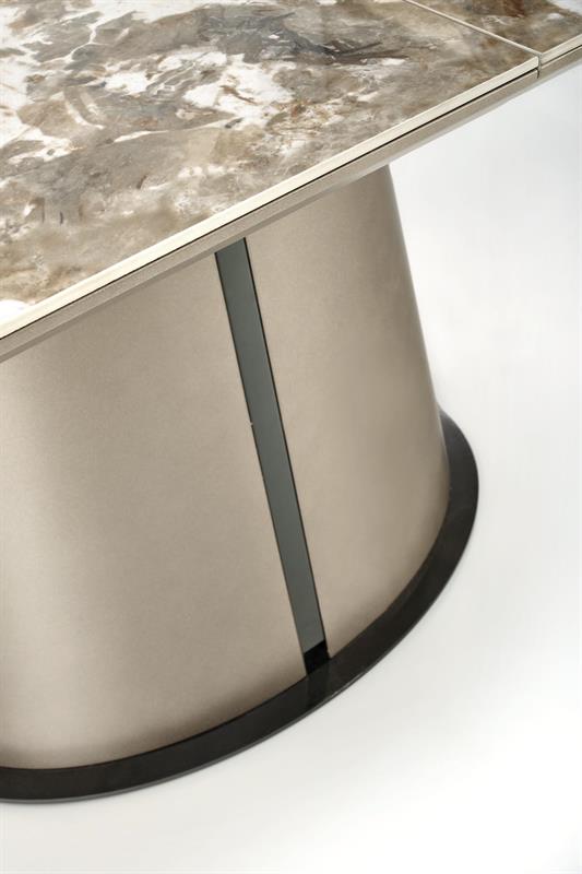 Elegancja w każdym detalu: Owalny ekstrawagancki stół na wielkiej nodze ROBINSON i jego owalny kształt nadaje wnętrzu niepowtarzalny, ekskluzywny charakter. Blat wykonany z płyty ceramicznej imituje marmur z subtelnymi wstawkami brązu, co dodaje mu niezwykłego uroku i klasy. Stalowa noga w kolorze beżowo-czarnym to solidna podstawa, która nadaje stołowi nie tylko stylowy wygląd, ale również trwałość na lata.