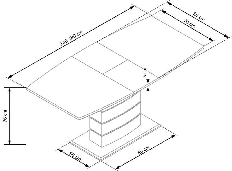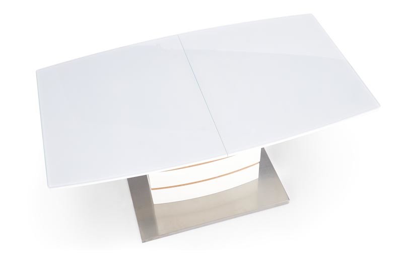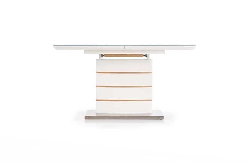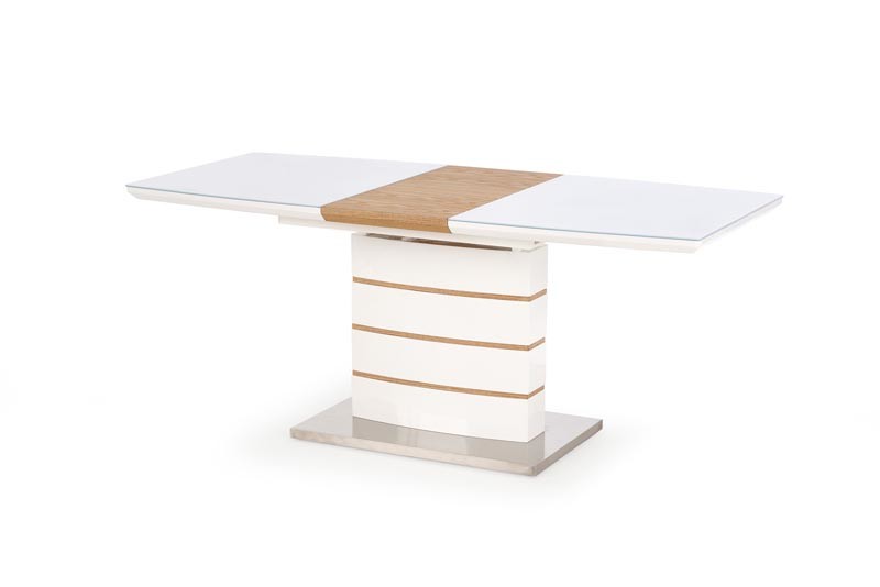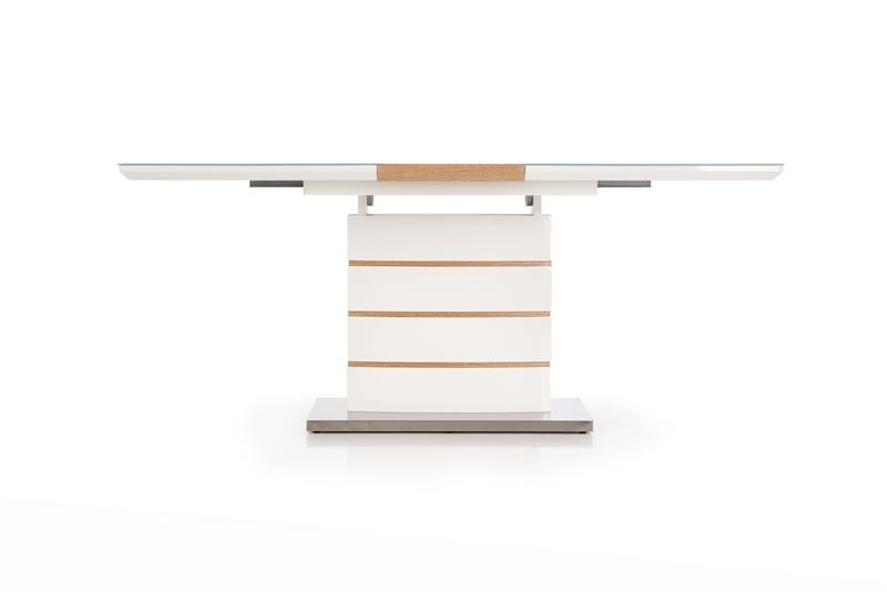 Jego biały połysk i dąb złoty tworzą spójną i harmonijną całość, podkreślając stylowe wnętrza. Rozkładany blat zapewnia dużą wygodę podczas spotkań z rodziną czy przyjaciółmi, a materiały najwyższej jakości – MDF lakierowany, szkło i stal nierdzewna – zapewniają trwałość i wytrzymałość.