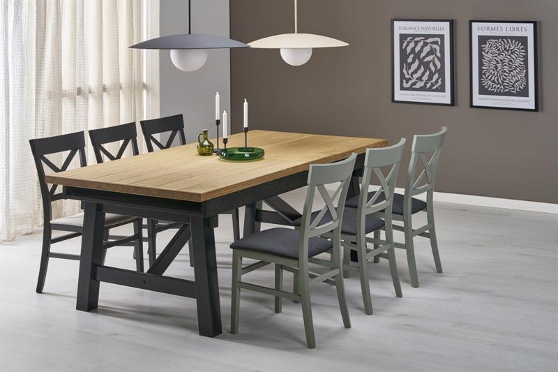 Blat stołu wykonany został z płyty MDF pokrytej dębowymi lamelami o grubości 5 mm, a jego obrzeża wykończone są litym drewnem, co nadaje całości elegancji i wytrzymałości. Konstrukcję wspierają solidne bukowe nogi w matowym, czarnym wybarwieniu, które nadają meblowi nowoczesnego i lekko industrialnego charakteru.