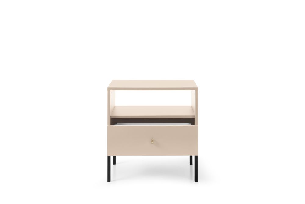 Stolik nocny z szufladą MAROCO i jego wyjątkowy wygląd podkreślają elementy wykończeniowe, które dodają mu wyrafinowanego charakteru. Dostęp do szuflady odbywa się za pomocą nowoczesnego otwierania dotykowego, dzięki czemu nie trzeba szukać uchwytu – delikatne dotknięcie wystarczy, by szuflada bezgłośnie się otworzyła.