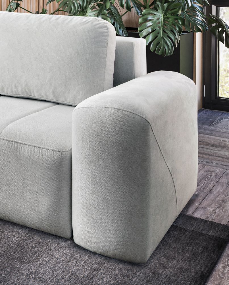MOLINA 2 oferuje także wyjątkową wygodę w codziennym użytkowaniu dzięki 5 dużym poduchom oparciowym, które zapewniają idealne podparcie pleców. Stylowe wykończenie, eleganckie linie oraz szeroka gama tkanin premium sprawiają, że narożnik dopasuje się do każdego wnętrza – od nowoczesnego loftu, przez minimalistyczne salony, aż po przytulne wnętrza skandynawskie.