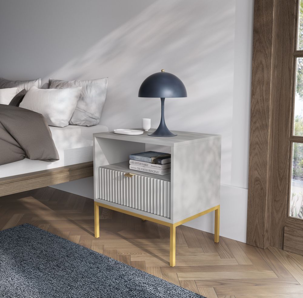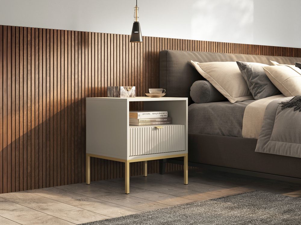 Szafka nocna z kolekcji NEMESIS to doskonały wybór dla tych, którzy pragną dodać swojej sypialni odrobinę stylowego blasku. Jej precyzyjnie frezowane fronty i subtelny odcień kaszmiru sprawiają, że przyciąga wzrok i nadaje wnętrzu przytulności. Szafka wykonana jest z wysokiej jakości płyty laminowanej, co gwarantuje trwałość i odporność na codzienne użytkowanie. Obrzeża wykończone w technologii ABS zapewniają elegancję i estetyczne wykończenie w kolorze płyty. Metalowe nogi i uchwyty dostępne są w wersji czarnej lub złotej, co pozwala na idealne dopasowanie do indywidualnych preferencji i stylu wnętrza. Szafka nocna NEMESIS stanowi idealne połączenie elegancji i funkcjonalności.
