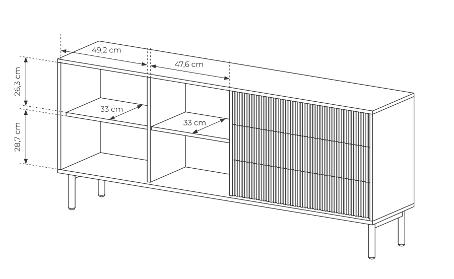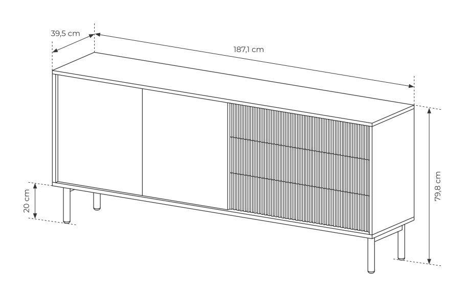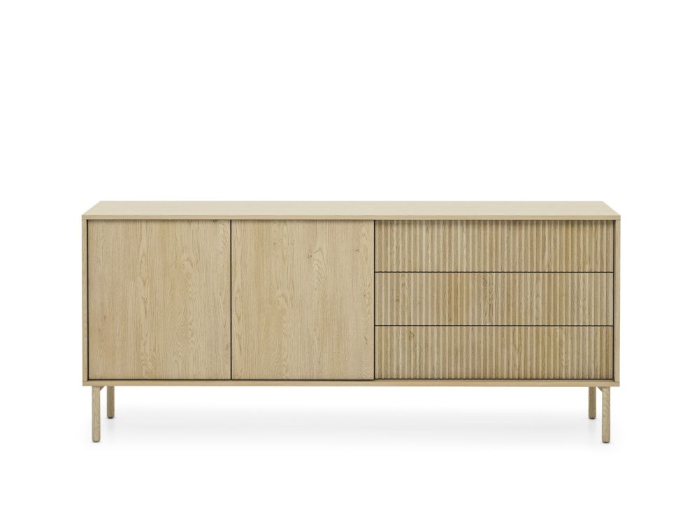 Komoda TATJANA o szerokości 187 cm to idealne połączenie nowoczesnego designu i praktycznych rozwiązań. Jej ryflowane fronty z płyty MDF w dekorze dąb cremona nadają wnętrzu ciepły, naturalny charakter, a system push-to-open sprawia, że otwieranie szuflad jest szybkie i wygodne, bez potrzeby używania uchwytów.