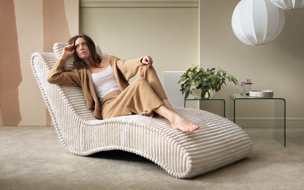 W standardzie wyposażony jest w ekskluzywną tkaninę premium o strukturze sztruksu – niezwykle przyjemną w dotyku, przyjazną dla dzieci, zwierząt i dodatkowo trudnopalną. Delikatne, ale wytrzymałe prążkowane włókna podkreślają luksusowy charakter mebla, nadając mu modne i przytulne wykończenie. Tył mebla został również estetycznie tapicerowany, co pozwala na ekspozycję szezlonga w przestrzeni jako mebla wolnostojącego.