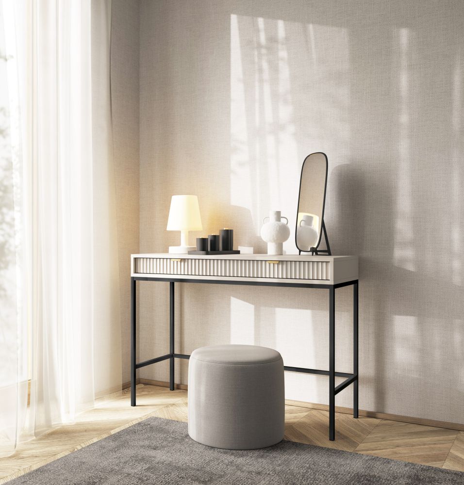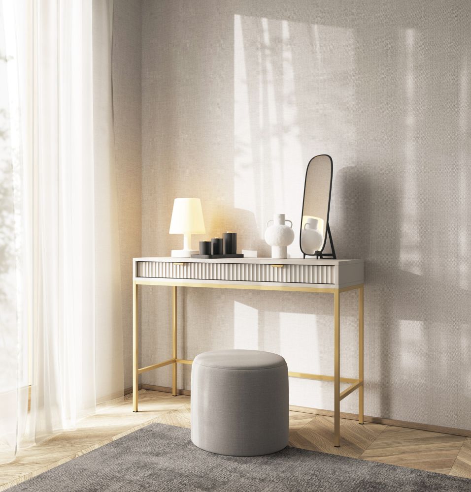 Toaletka konsola NEMESIS, dostępna w subtelnym kolorze kaszmiru, jest prawdziwą ozdobą tej kolekcji. Jej frezowany front przyciąga wzrok i wprowadza do wnętrza nutę nowoczesnej elegancji. Zbudowana z najwyższej jakości płyty laminowanej oraz wykończona odpornymi na uszkodzenia obrzeżami ABS w kolorze mebla, zapewnia trwałość i piękno na lata. Wybór metalowych nóg i uchwytów w kolorze złotym lub czarnym pozwala dostosować ją do charakteru wnętrza – złote dodatki podkreślą luksusowy klimat, a czarne dodadzą nowoczesnej, surowej elegancji.
