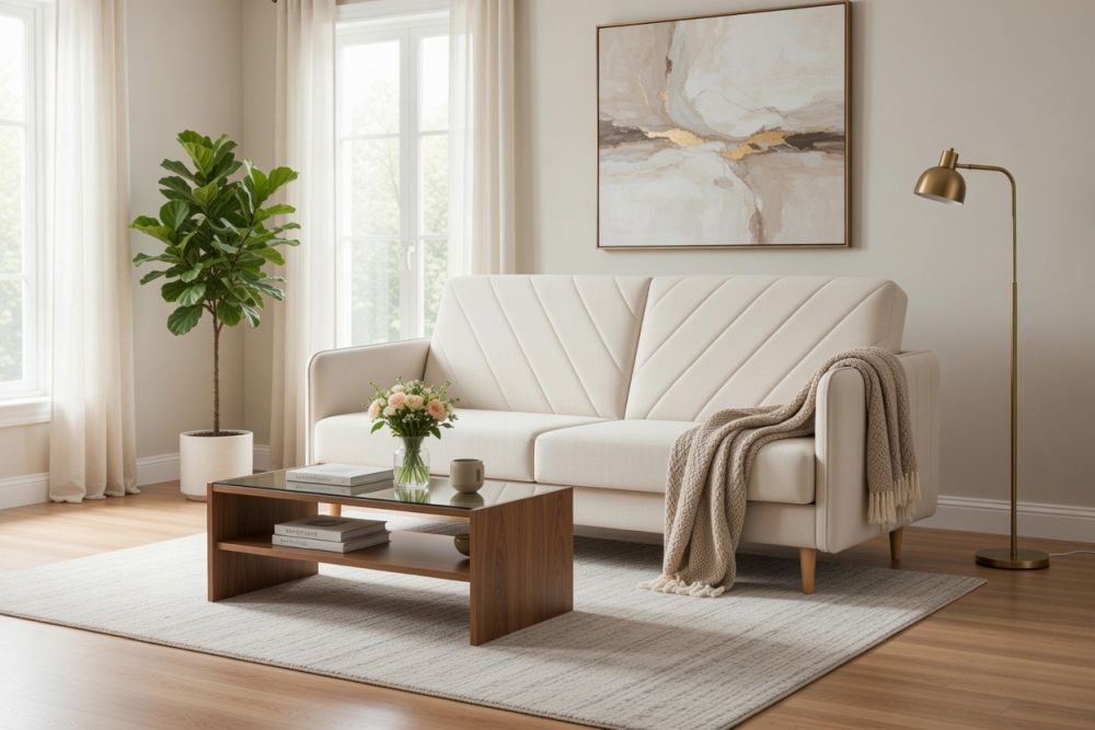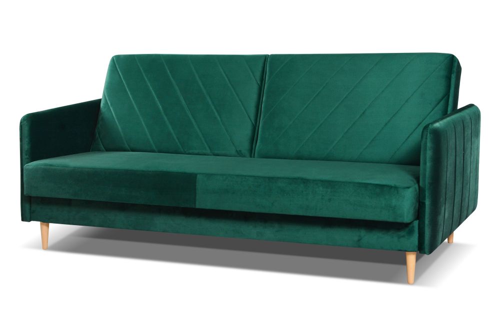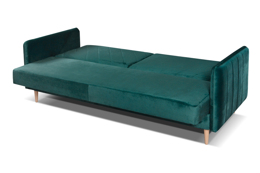 Dodatkowym atutem jest praktyczny pojemnik na pościel, który ułatwia przechowywanie i pomaga utrzymać porządek w salonie. Drewniane nóżki z naturalnego buku nadają całości eleganckiego charakteru i podkreślają solidność wykonania.