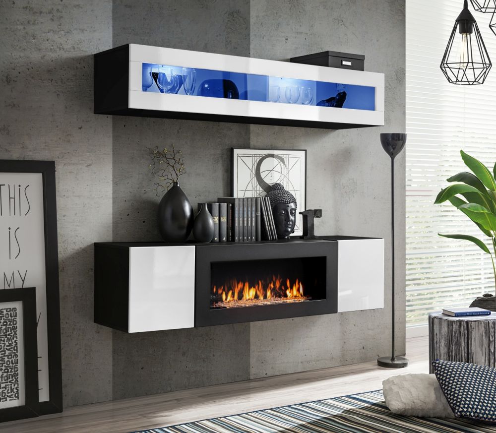Jednym z głównych atutów SKY N2 jest pięknie oszklona witrynka wisząca, która nadaje meblościance wyjątkowego charakteru. Ta elegancka i stylowa komoda z kominkiem jest dostępna w czterech wersjach kolorystycznych, w tym w połysku białym z czarnym, co pozwoli Ci na dopasowanie jej do Twojego wnętrza.