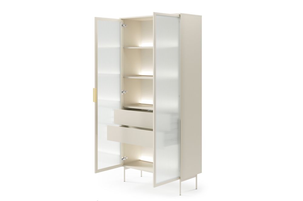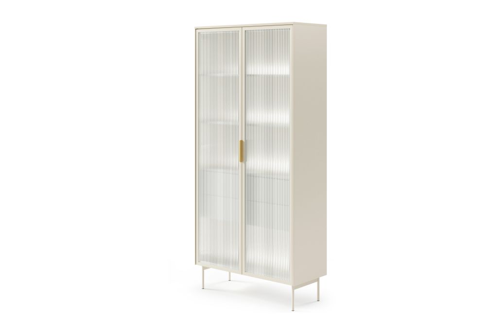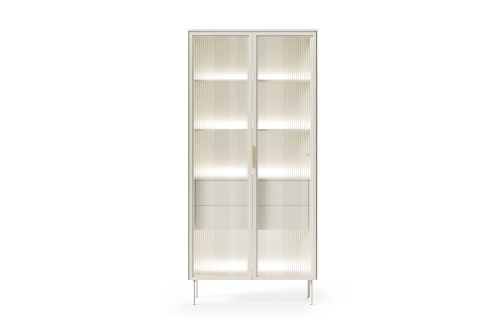 Z pozoru prosta, lecz przy bliższym spojrzeniu zaskakuje – niczym elegancka sukienka z ukrytym haftem. Front z ornamentową szybą typu flutes przypomina zmysłowe refleksy światła za szronionym szkłem. Przechowuje, ale i pokazuje – z klasą. Metalowe nóżki oraz uchwyty w złotej anodzie dodają jej biżuteryjnego charakteru, balansując pomiędzy nowoczesnością a ponadczasową estetyką.