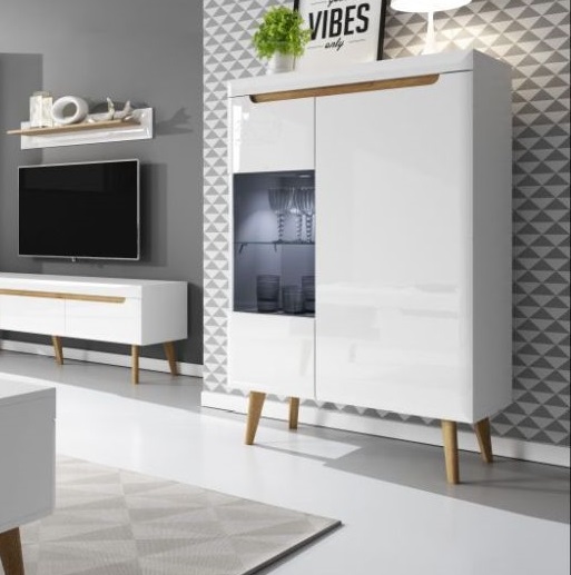 Witryna niska Nori 90 w odcieniu biały połysk o wymiarach 90/134/40 cm będzie świetnym uzupełnieniem każdego wnętrza utrzymanego w stylu naturalnym i skandynawskim. Oświetlenie Led w opcji dodatkowej 99 zł.