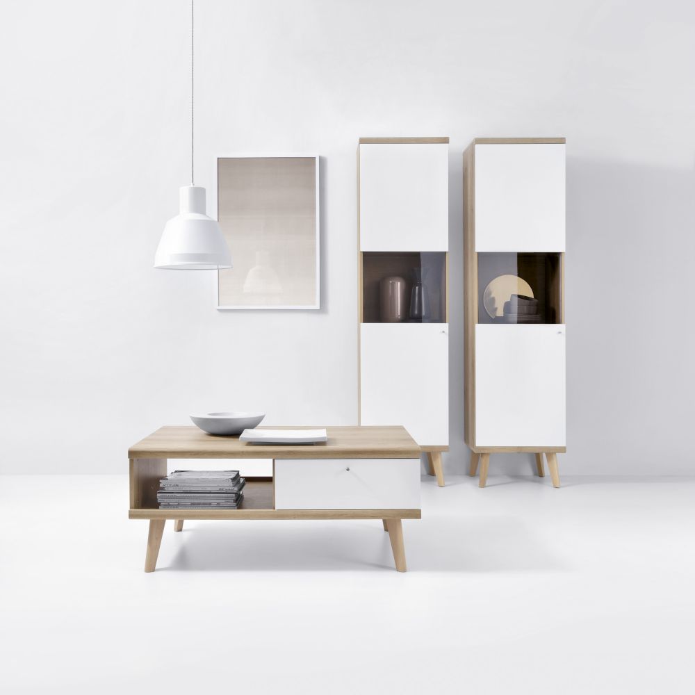 Kompromis między formą i funkcją – wykorzystaj go i postaw swoje wnętrze. Zestawienie dębowego dekoru i drewnianej nogi z białym frontem, nada twojemu wnętrzu ciepła i lekkości.
