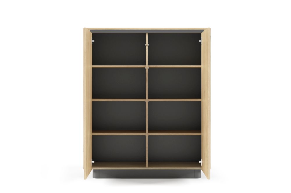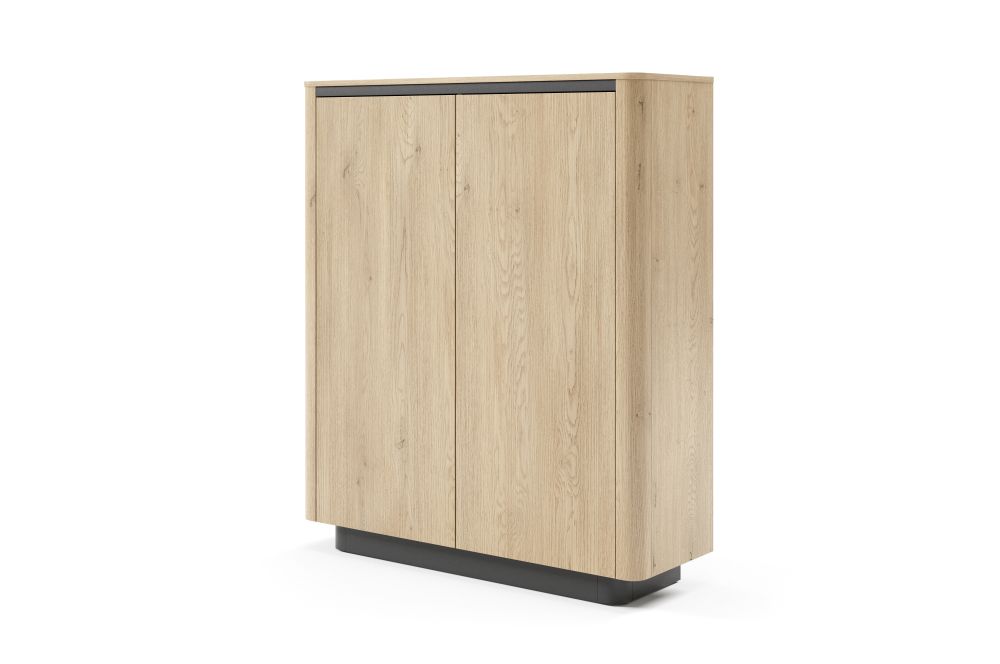 Naturalna kolorystyka dębu cremona w połączeniu z akcentami w głębokiej czerni (ozdobna listwa pod blatem, cokół oraz wnętrze szuflad) sprawia, że komoda nie tylko wygląda nowocześnie, ale doskonale odnajdzie się w różnych stylach wnętrz – od skandynawskich po loftowe. Brak uchwytów i system push-to-open podkreślają minimalistyczny styl, a pełen wysuw szuflad na kulkowych prowadnicach gwarantuje wygodę i trwałość użytkowania.