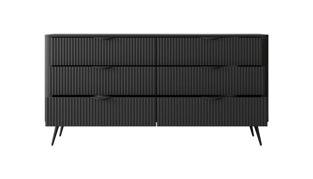 Czarna komoda MOCCA to propozycja dla miłośników eleganckich, wyrazistych wnętrz. Jej zaokrąglony kształt i wysoka podstawa nadają bryle lekkości i nowoczesnego charakteru. Dzięki sześciu pojemnym szufladom z łatwym, pełnym wysuwem, mebel jest nie tylko efektowny, ale też wyjątkowo funkcjonalny – idealny do przechowywania w salonie, sypialni czy przedpokoju.