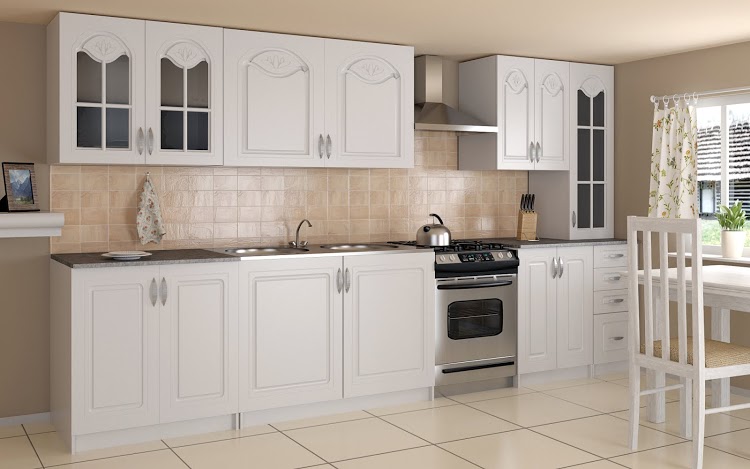 Zestaw ten zawiera w sobie szczegółowe wykonanie frontów, które odznaczają się stylowymi rzeźbieniami i żłobieniami. Ramki w przeszklonych drzwiczkach utrzymują całość w klasycznym stylu. Pojemne szafki i szuflady pomieszczą wszelkie niezbędne gadżety kuchenne, jak i produkty.
